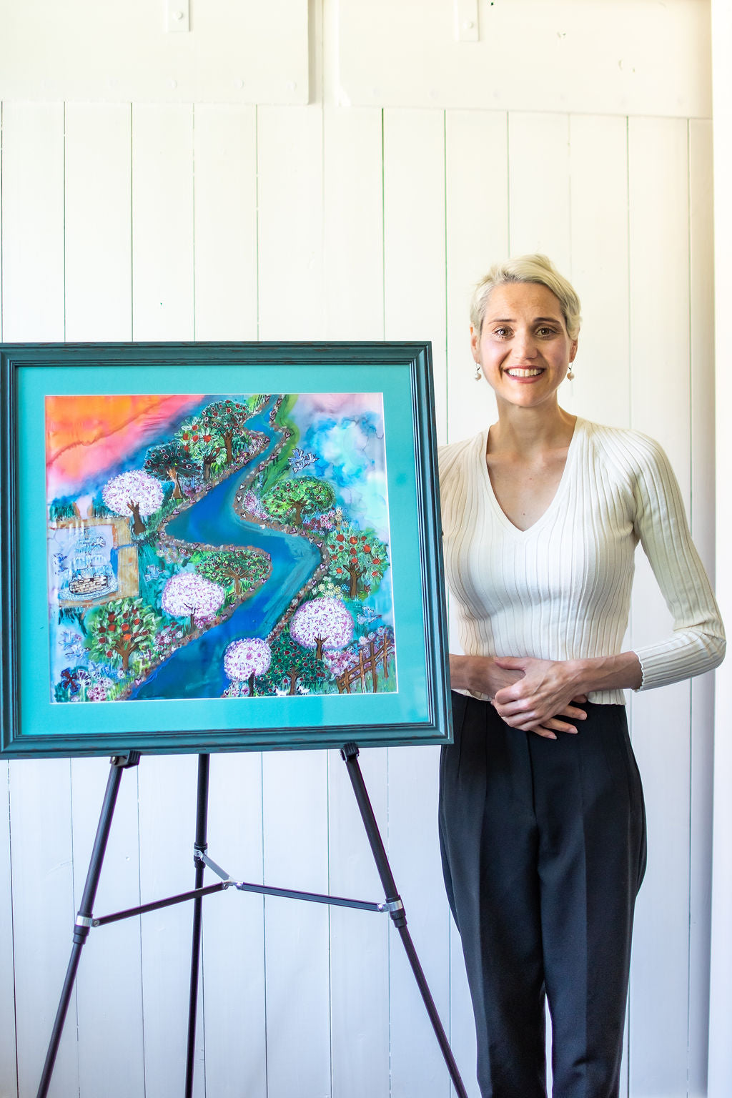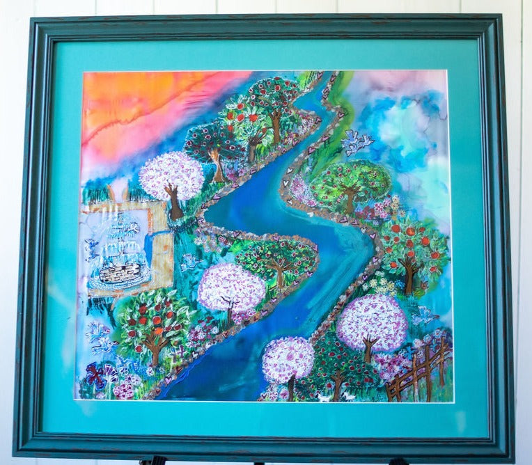 D-196   AN ORIGINAL SILK PAINTING by CYDNEY    EVERYWHERE THE RIVER FLOWS IT GIVES LIFE