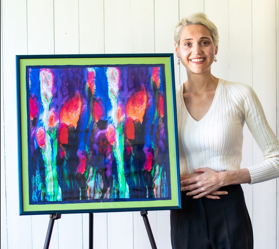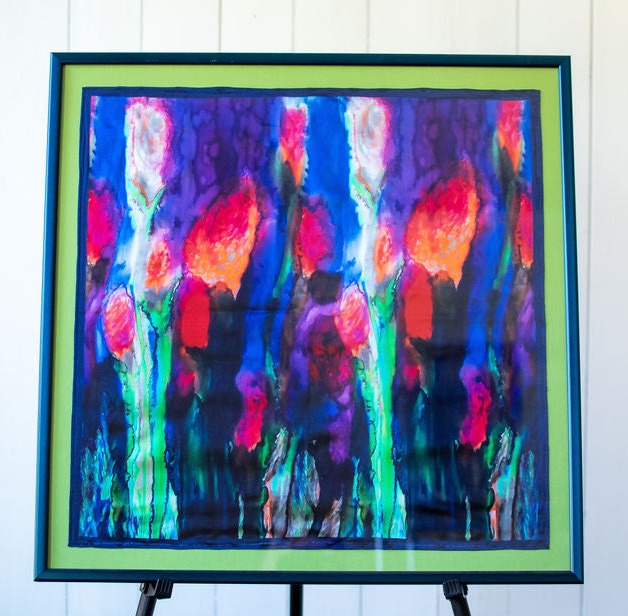 Created by Cydney and painted on silk.  The creative joy and humour of the artist radiates and celebrates with colour and imagination.