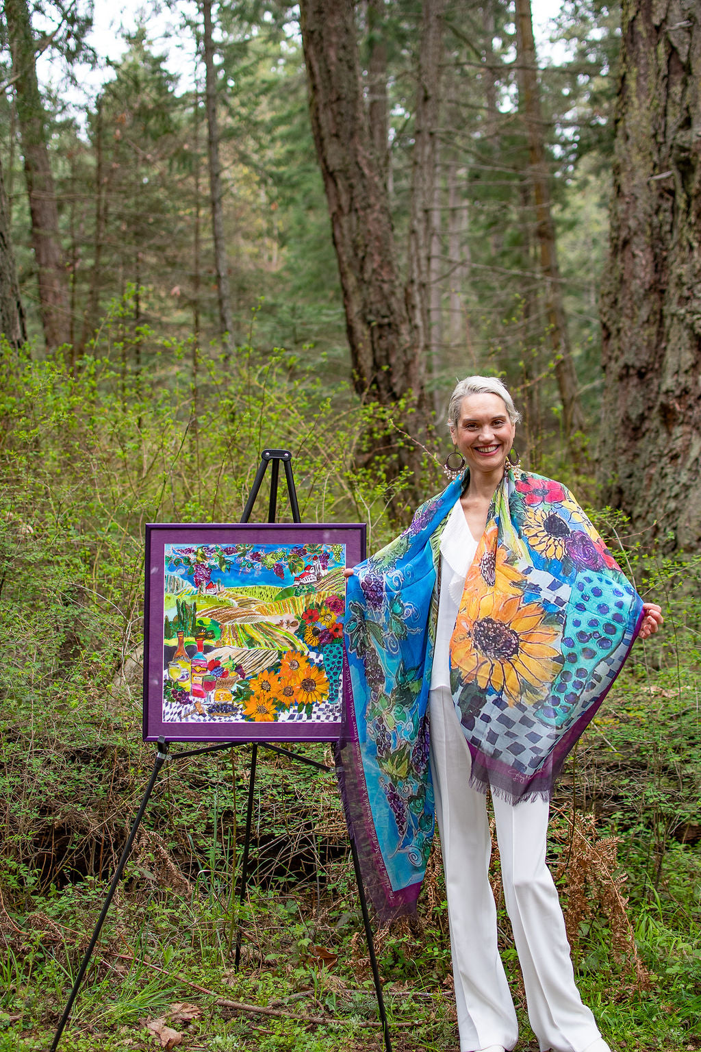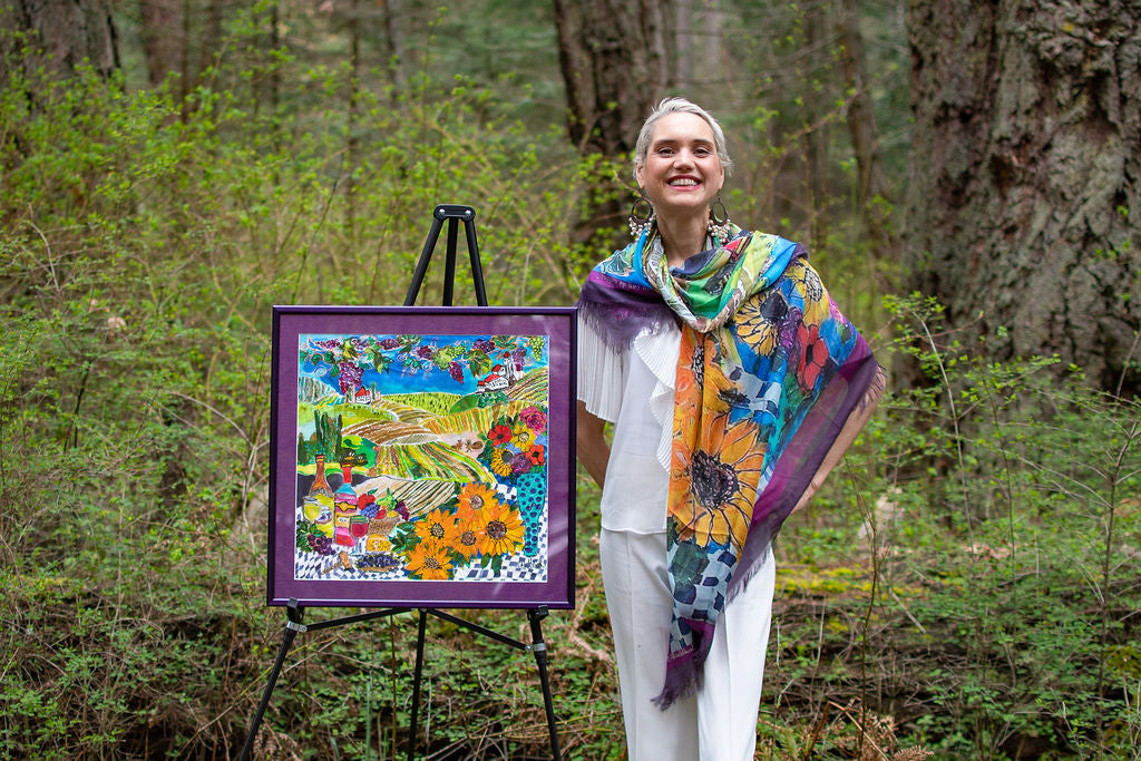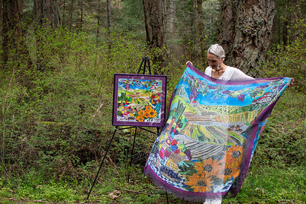 Created by Cydney and painted on silk.  The creative joy and humour of the artist radiates and celebrates with colour and imagination.