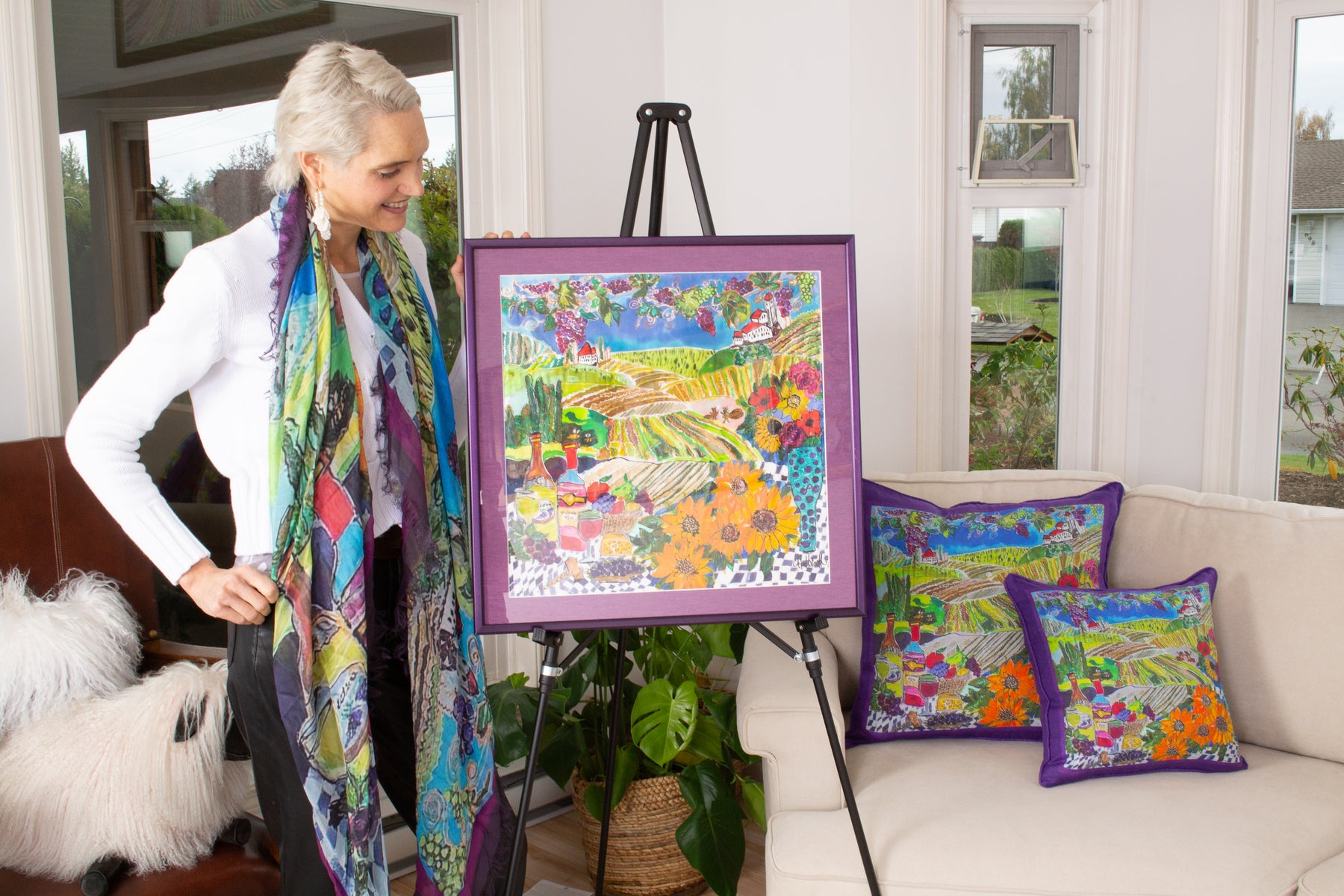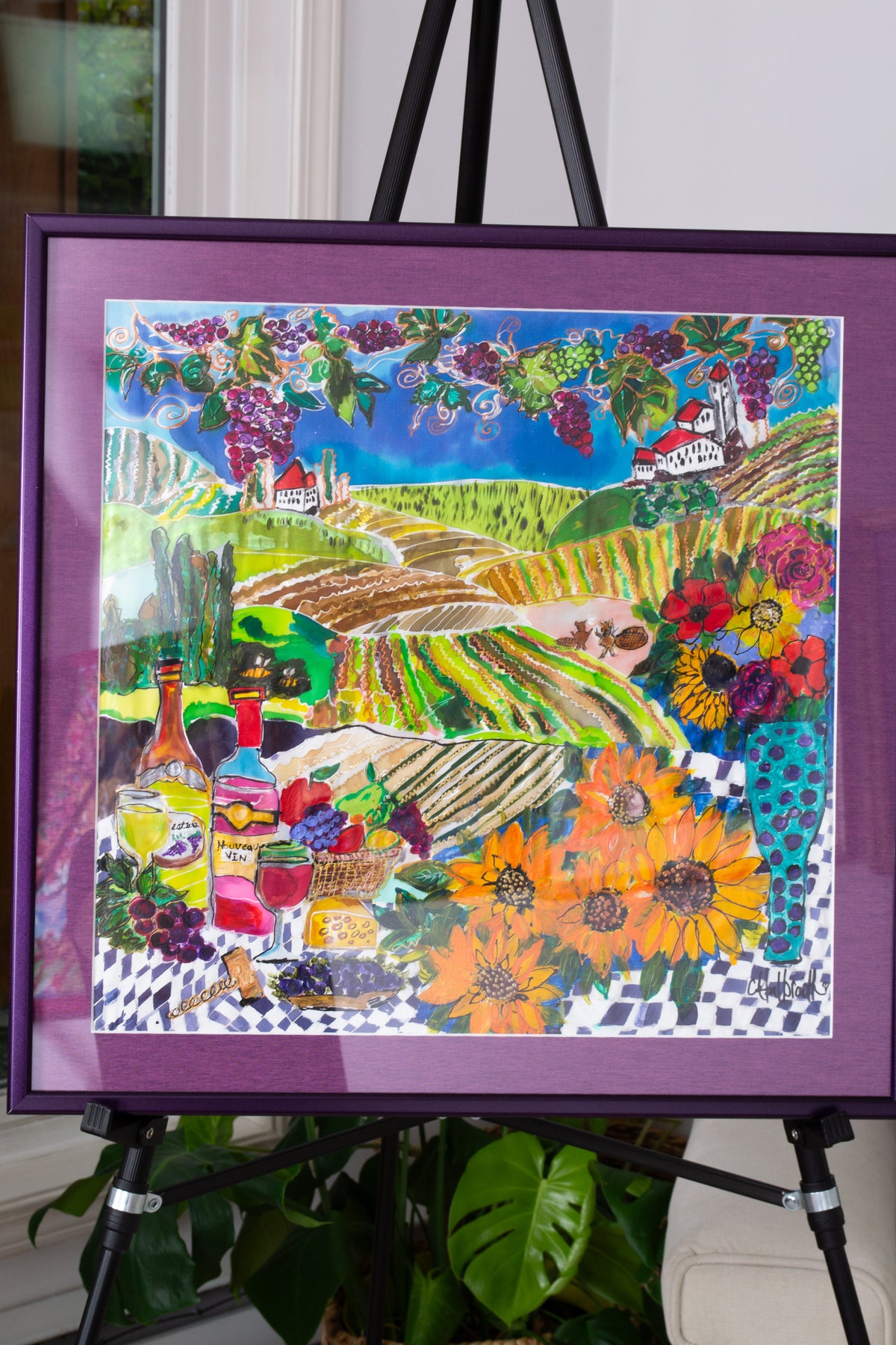 The painting is framed in a rich purple.