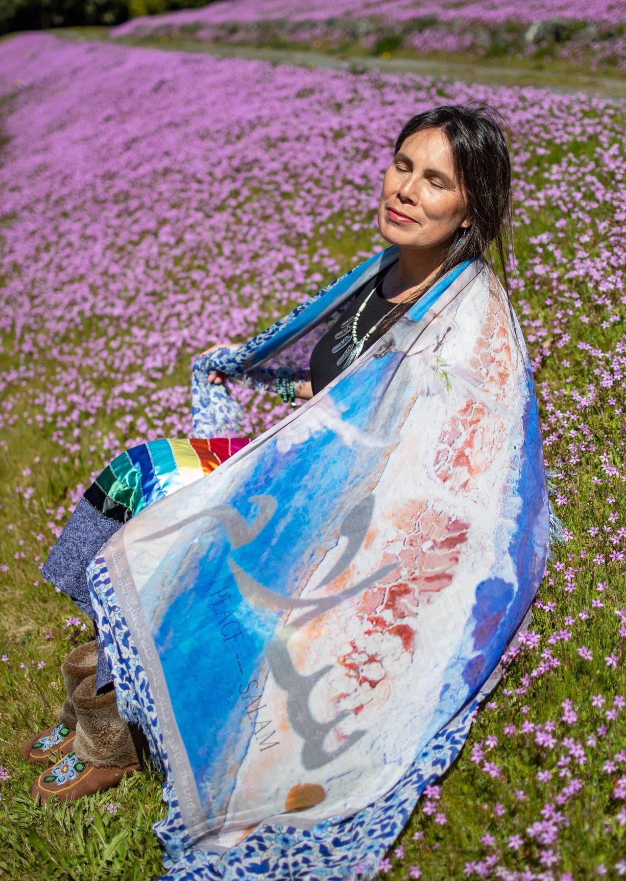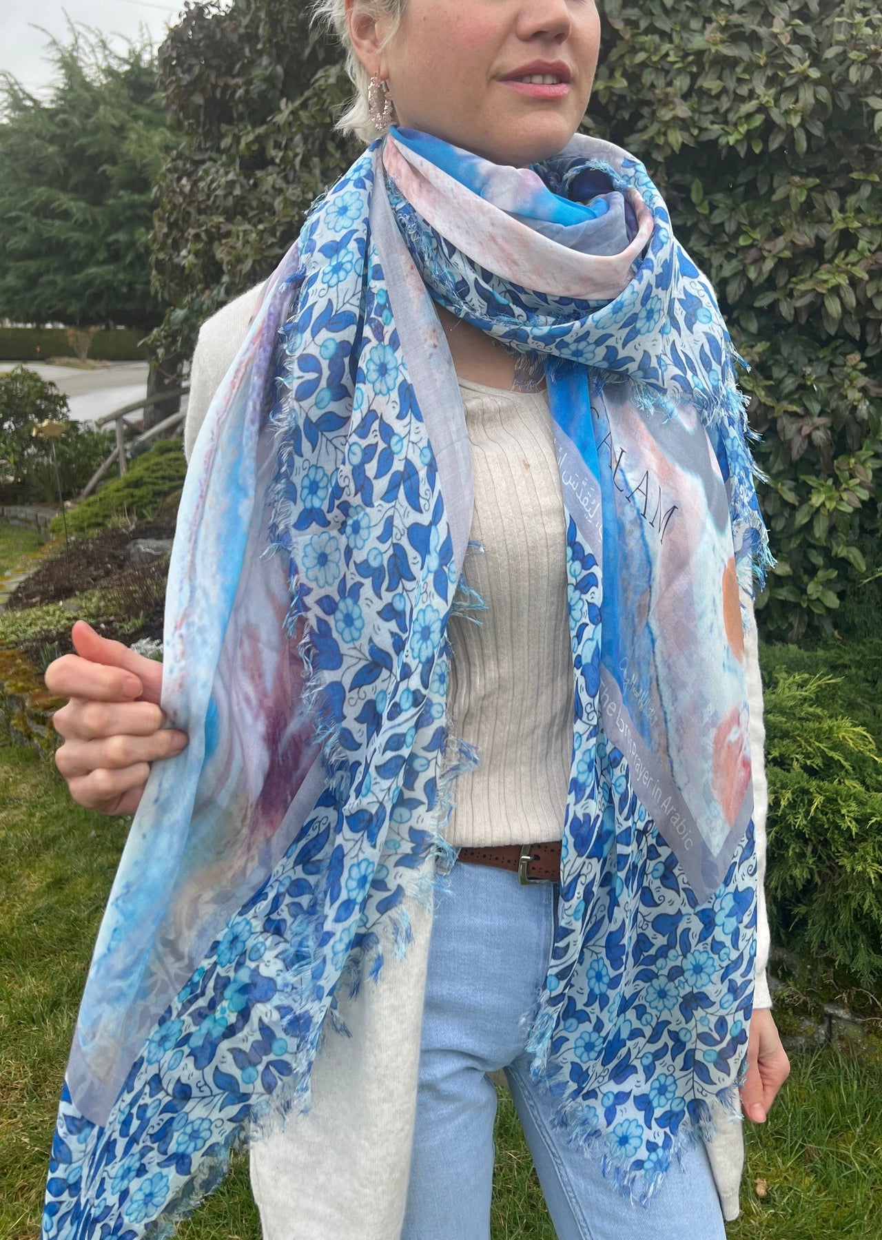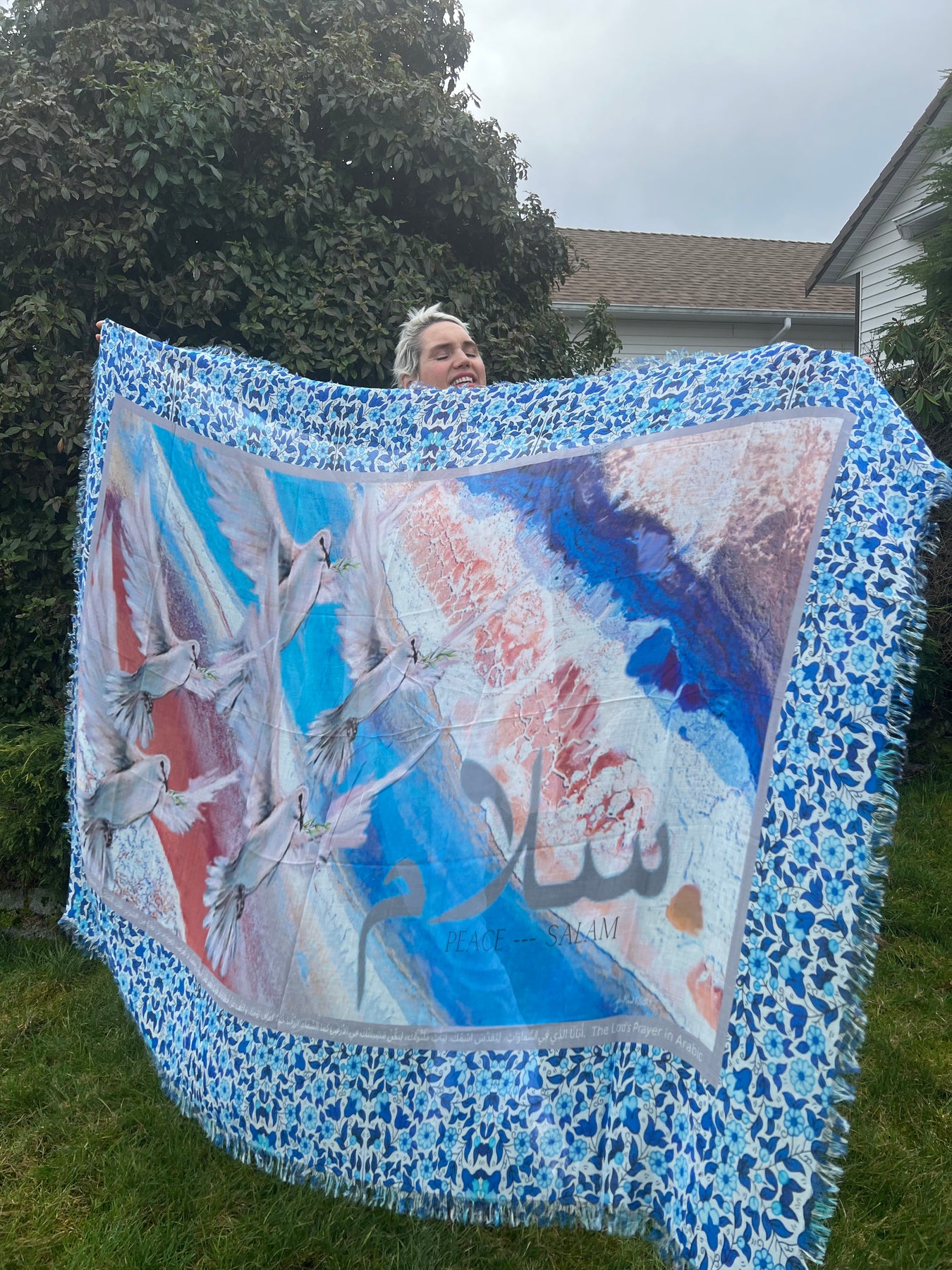 Salam means Peace. Peace be upon you as you are embraced in true love from the inmost place. It is written in your heart. May the peace that surpasses all understanding envelope your every concern. God hears your every prayer and need. Every thing that troubles you, also troubles his heart . His heart is for peace every moment of your life. Be still and know that He is God. This scarf has been designed for our brothers and sisters in the Middle Eastern part of the world. The Lords prayer in Arabic is inscribed on this textile, also for you to read in English and Arabic on this card. We continue to stand in the gap and pray for our brothers and sisters in the Middle East who need our prayers. The Lord’s Prayer in Arabic