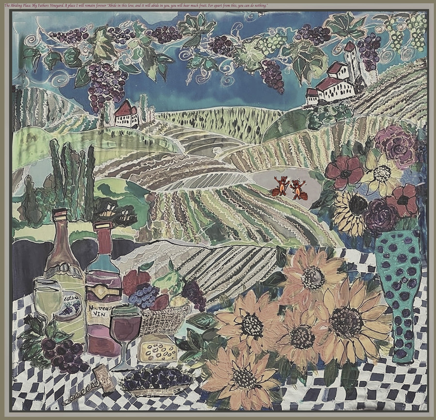 My Fathers Vineyard is the abiding place. A place I will remain forever. Abide in this love, and it will abide in you, you will bear much fruit. Everlasting fruit! For apart from this, you can do nothing. Therefore abide in the vine you will do just fine, but...don't forget to drink some wine, time after time!