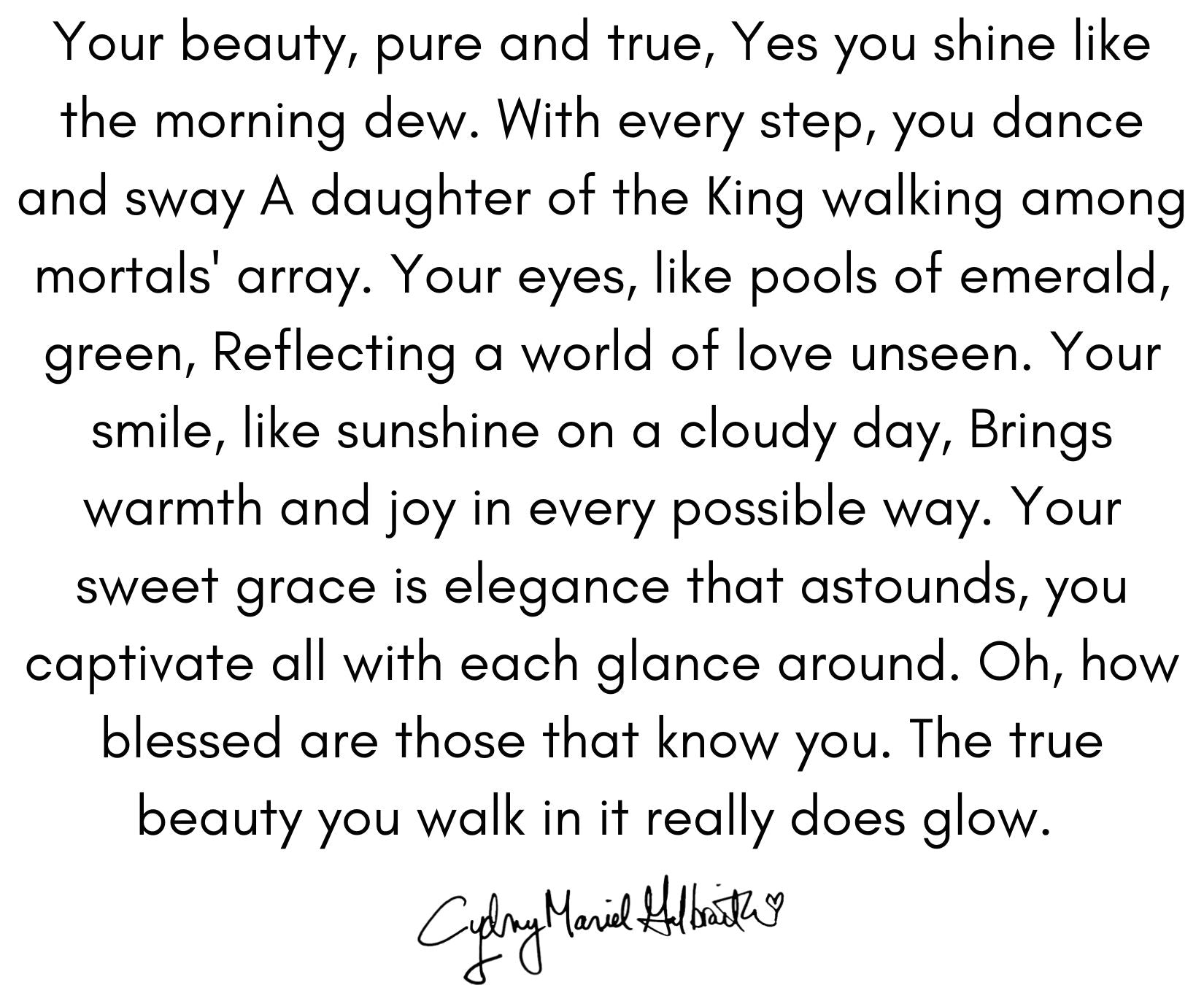 Your beauty, pure and true, Yes you shine like the morning dew. With every step, you dance and sway A daughter of the King walking among mortals' array. Your eyes, like pools of emerald, green, Reflecting a world of love unseen. Your smile, like sunshine on a cloudy day, Brings warmth and joy in every possible way. Your sweet grace is elegance that astounds, you captivate all with each glance around. Oh, how blessed are those that know you. The true beauty you walk in it really does glow.