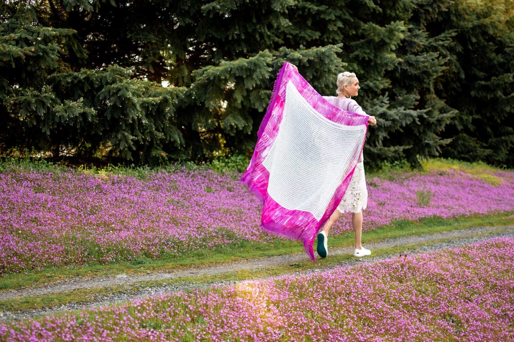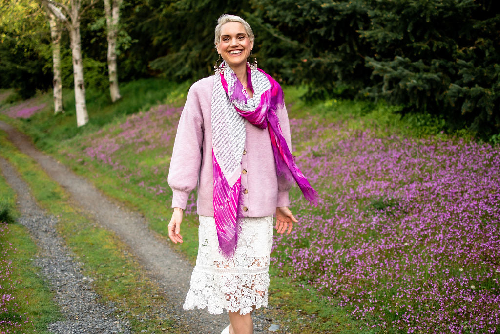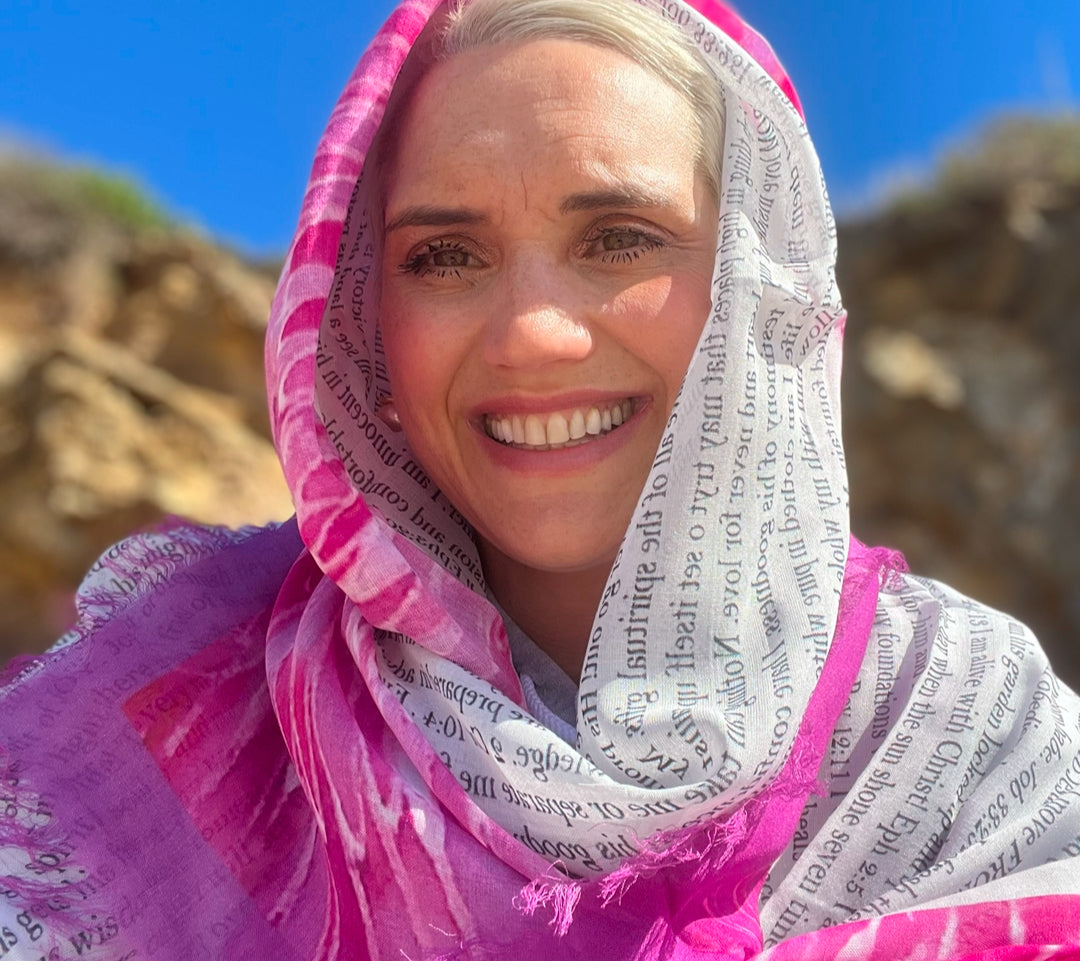 This is a forever favorite shawl. Back by popular demand. Through a really tough season God told me to write all of the promises I could think of down. So I did. There are maybe 10,000 promises on this scarf surrounded by hand-painted angel wings. These are words to affirm your identity. Words of love, words of hope. Words that will speak to your inmost place reminding you that you are a child of the most high God! There are about 10000 promises saturated on this prayer shawl. Wear it on a tough day, or hang it on your wall. Every time you look at it you will have a new revelation of just how much love God has for you. We must remind ourselves not just who we are some days, but WHO'S we are. You are a ROYAL child of God. No flaw in you, forged as a love weapon, treasured possession, one in a million, unique, full of wonder! You were created with a destiny and a purpose! This is a scarf that truly will love you more than you know! Makes a great gift! Comes wrapped in a luxury pouch with a sheet of declarations!