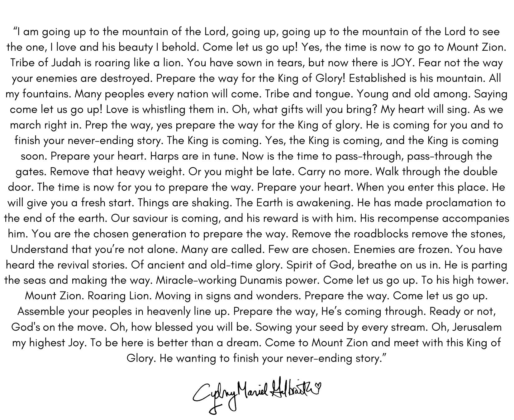 “I am going up to the mountain of the Lord, going up, going up to the mountain of the Lord to see the one, I love and his beauty I behold. Come let us go up! Yes, the time is now to go to mount Zion. Tribe of Judah is roaring like a lion. You have sown in tears, but now there is JOY. Fear not the way your enemies are destroyed. Prepare the way for the King of Glory! Established is his mountain. All my fountains. Many peoples every nation will come. Tribe and tongue. Young and old among. Saying come let us go up! Love is whistling them in. Oh, what gifts will you bring? My heart will sing. As we march right in. Prep the way, yes prepare the way for the King of glory. He is coming for you and to finish your never-ending story. The King is coming. Yes, the King is coming, and the king is coming soon. Prepare your heart. Harps are in tune. Now is the time to pass-through, pass-through the gates. Remove that heavy weight. Or you might be late. Carry no more. Walk through the double door. The time is now for you to prepare the way. Prepare your heart. When you enter this place. He will give you a fresh start. Things are shaking. The Earth is awakening. He has made proclamation to the end of the earth. Our saviour is coming, and his reward is with him. His recompense accompanies him. You are the chosen generation to prepare the way. Remove the roadblocks remove the stones, Understand that you’re not alone. Many are called. Few are chosen. Enemies are frozen. You have heard the revival stories. Of ancient and old-time glory. Spirit of God, breathe on us in. He is parting the seas and making the way. Miracle-workingDunamis power. Come let us go up. To his high tower. Mount Zion. Roaring Lion. Moving in signsand wonders. Prepare the way. Come let us go up. Assemble your peoples in heavenly line up. Prepare the way, He’s coming through. Ready or not, God'sonthe move. Oh, how blessed you will be. Sowing your seed by every stream. Oh, Jerusalem my highest Joy. To be here is better than a dream. Come to Mount Zion and meet with this King of Glory. He wanting to finish your never-ending story.”