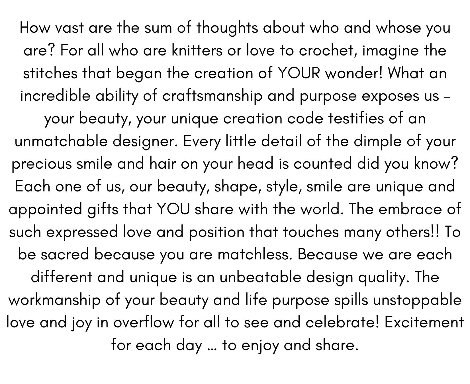 How vast are the sum of thoughts about who and whose you are? For all who are knitters or love to crochet, imagine the stitches that began the creation of YOUR wonder! What an incredible ability of craftsmanship and purpose exposes us – your beauty, your unique creation code testifies of an unmatchable designer. Every little detail of the dimple of your precious smile and hair on your head is counted did you know? Each one of us, our beauty, shape, style, smile are unique and appointed gifts that YOU share with the world. The embrace of such expressed love and position that touches many others!! To be sacred because you are matchless. Because we are each different and unique is an unbeatable design quality. The workmanship of your beauty and life purpose spills unstoppable love and joy in overflow for all to see and celebrate! Excitement for each day … to enjoy and share.