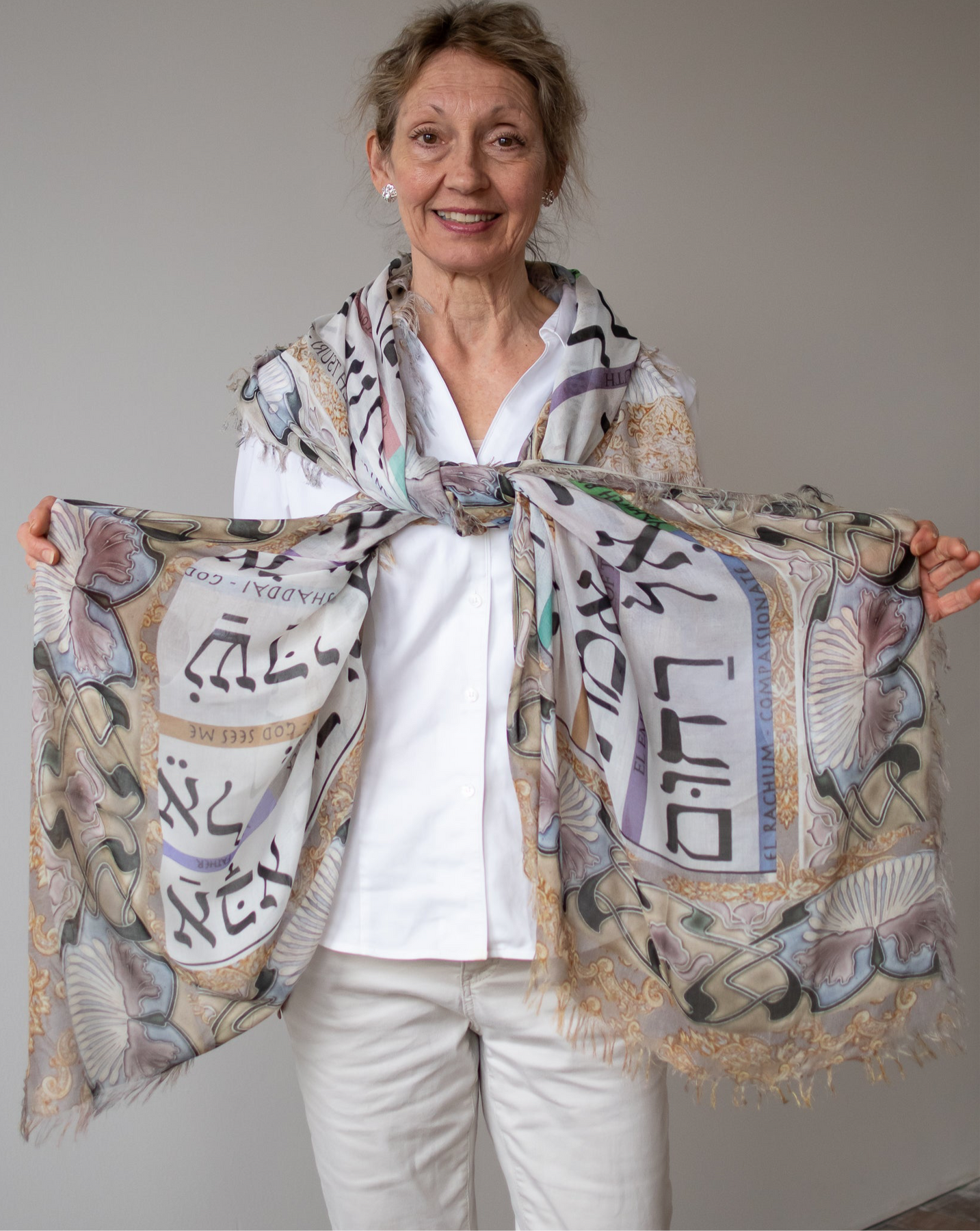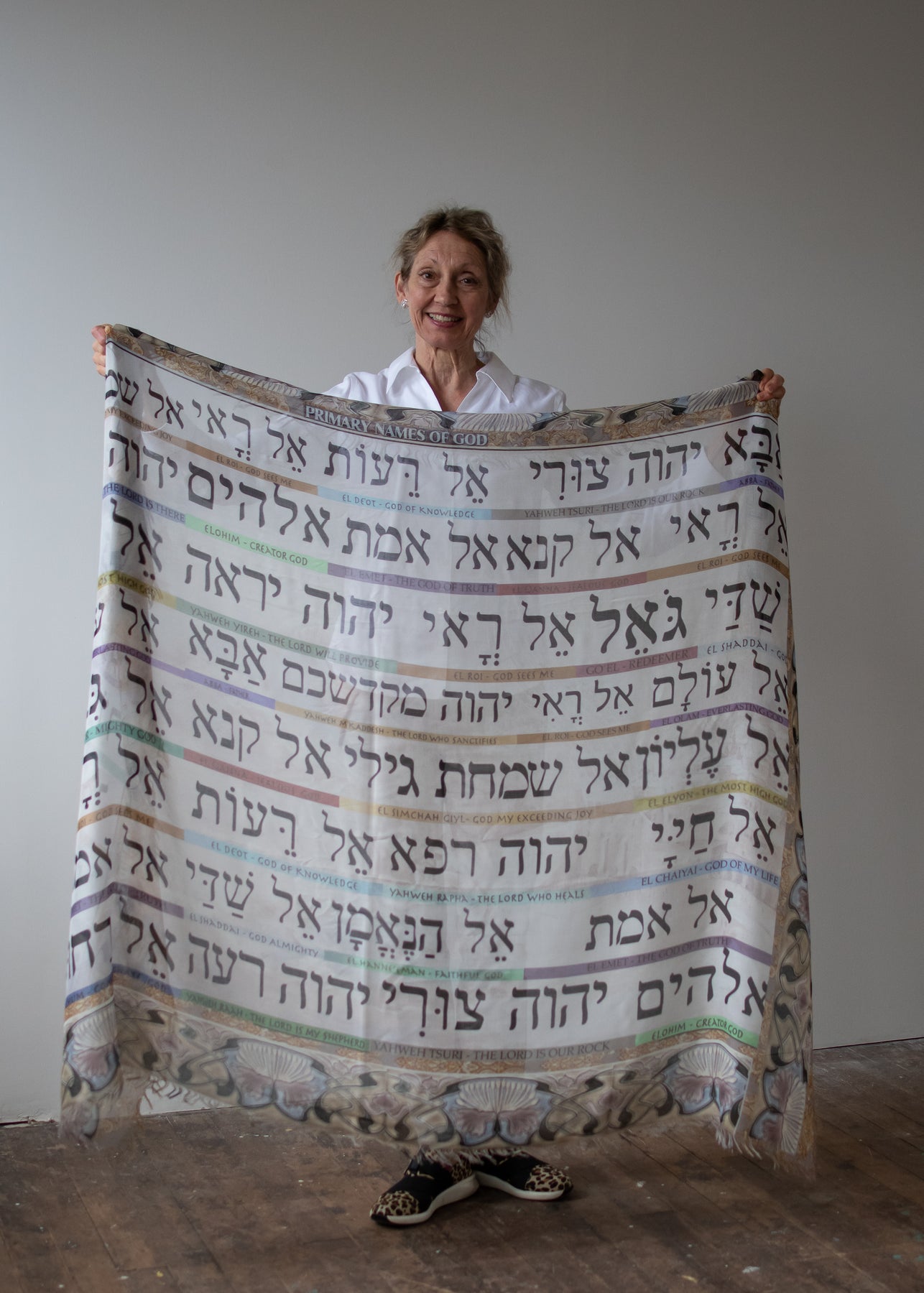 This is a prophetic prayer shawl designed by Cydney. It has all the names of God in Hebrew with english meanings below each name. There are as many as I could fit on here! ( next edition coming soon!)