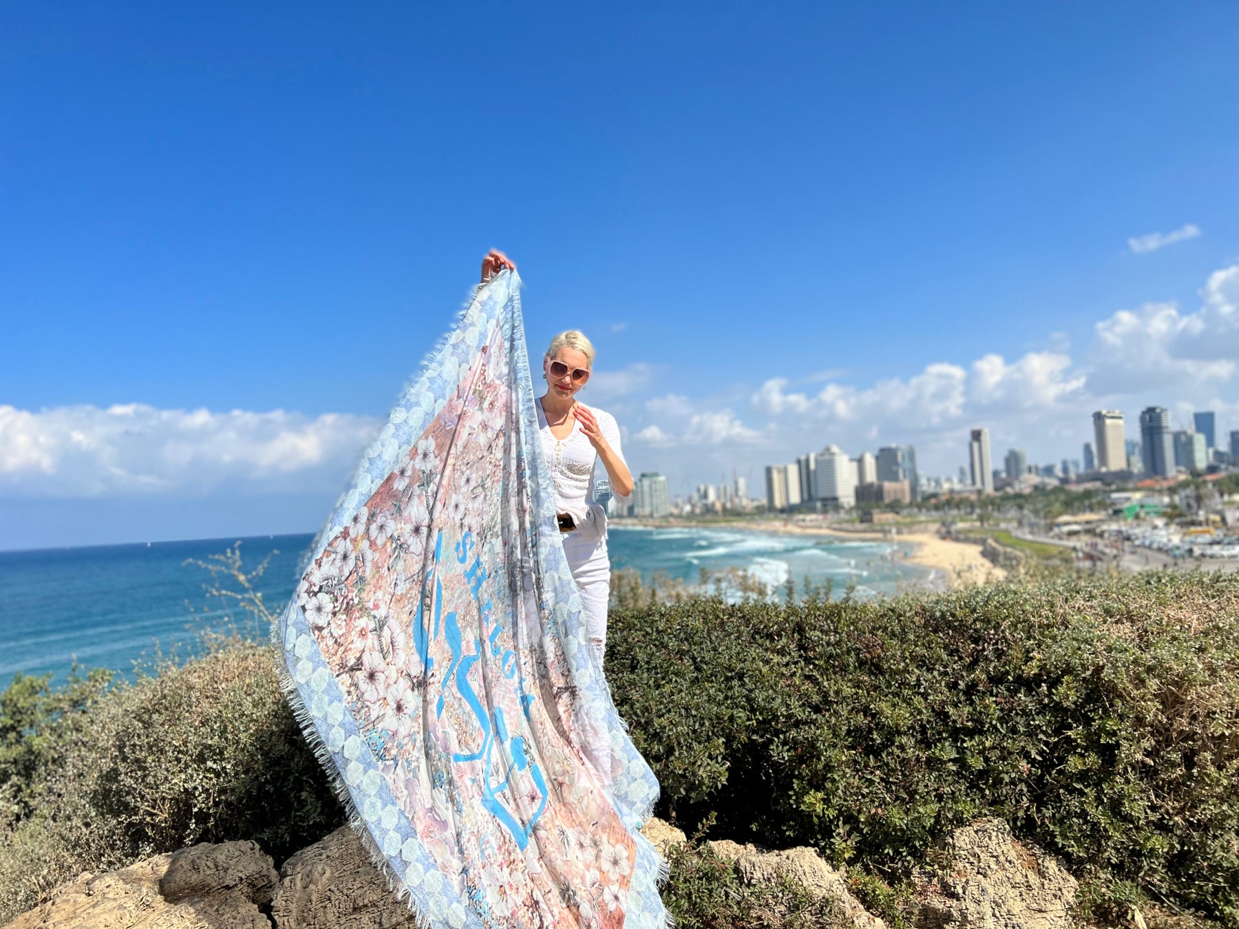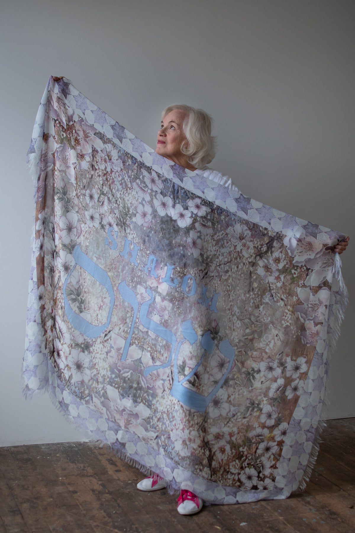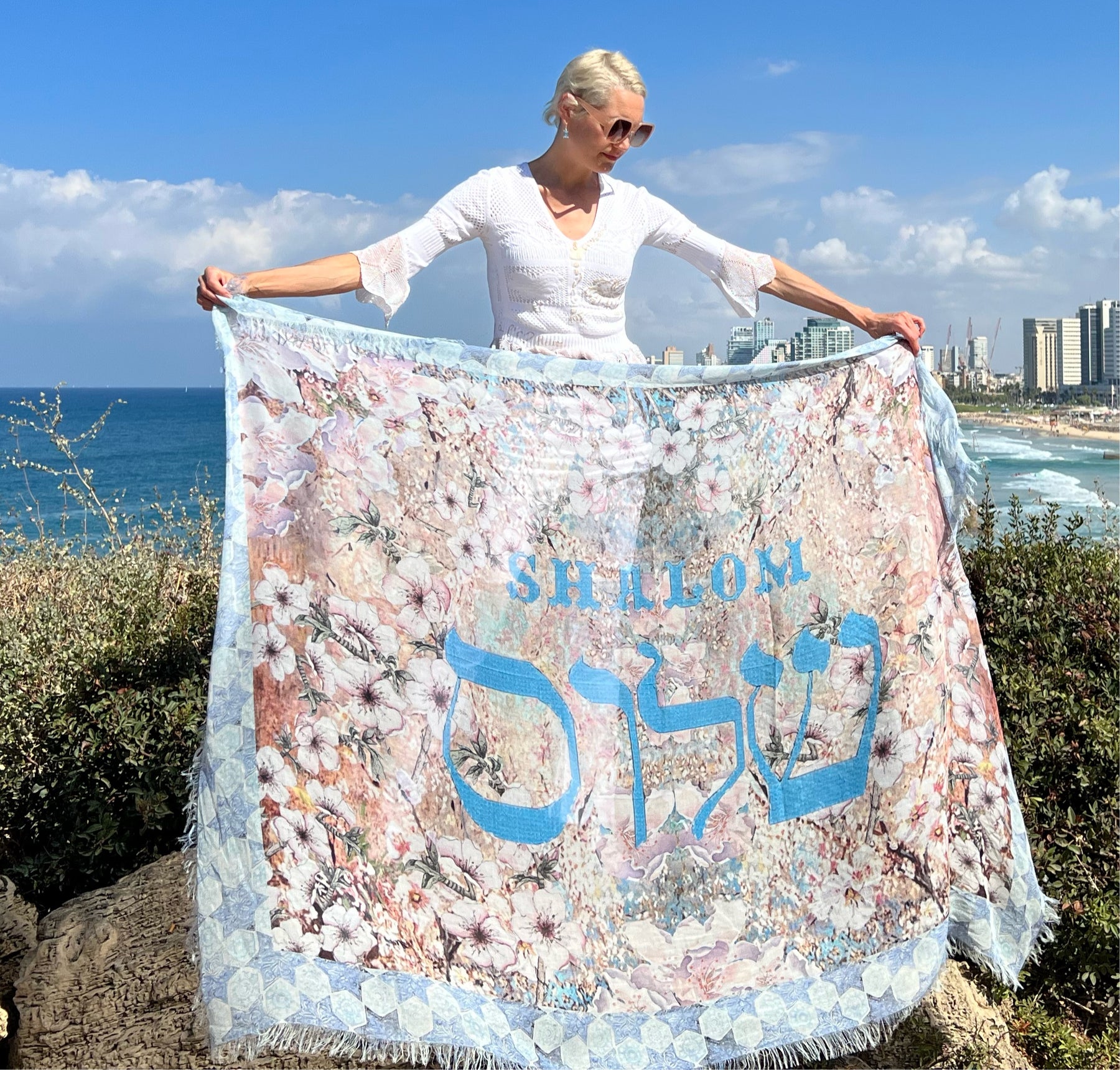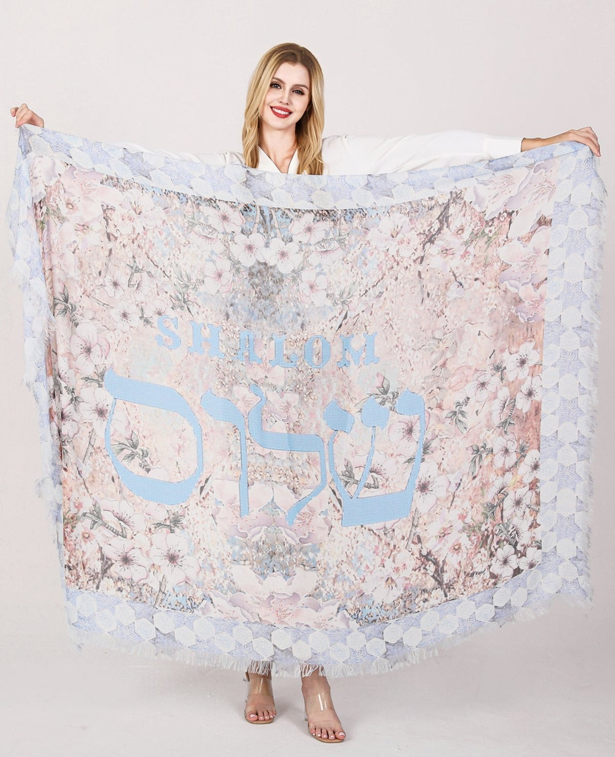 שלום in Hebrew, SHALOM in English is on this luxury collectors shawl.