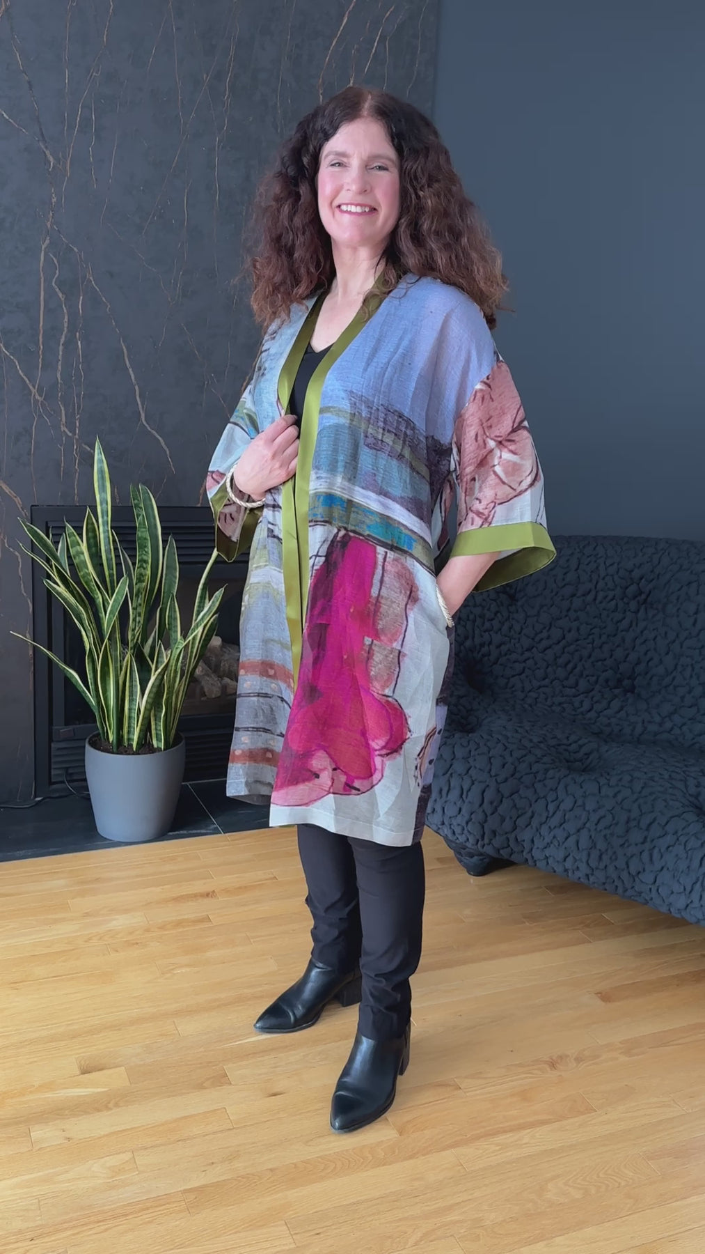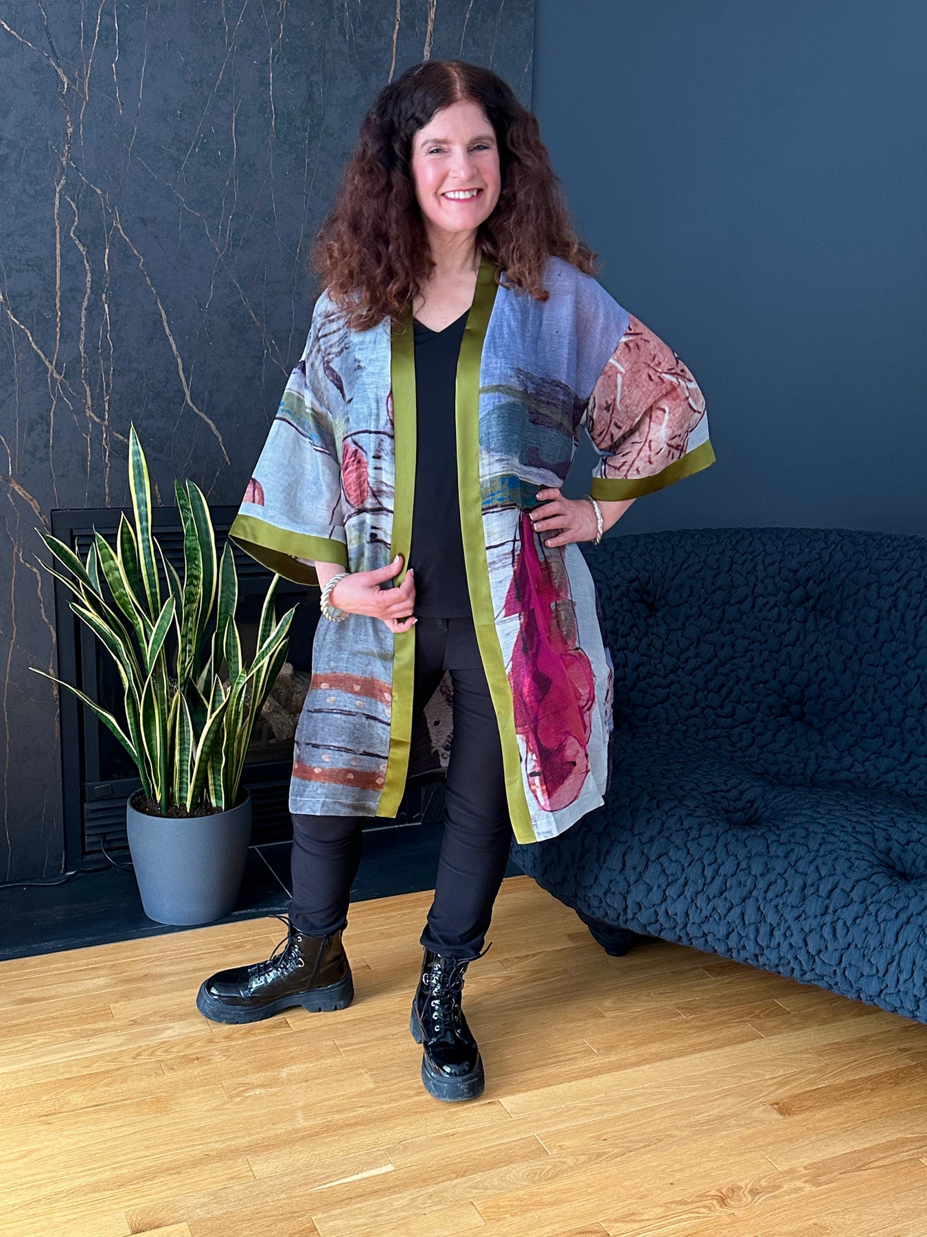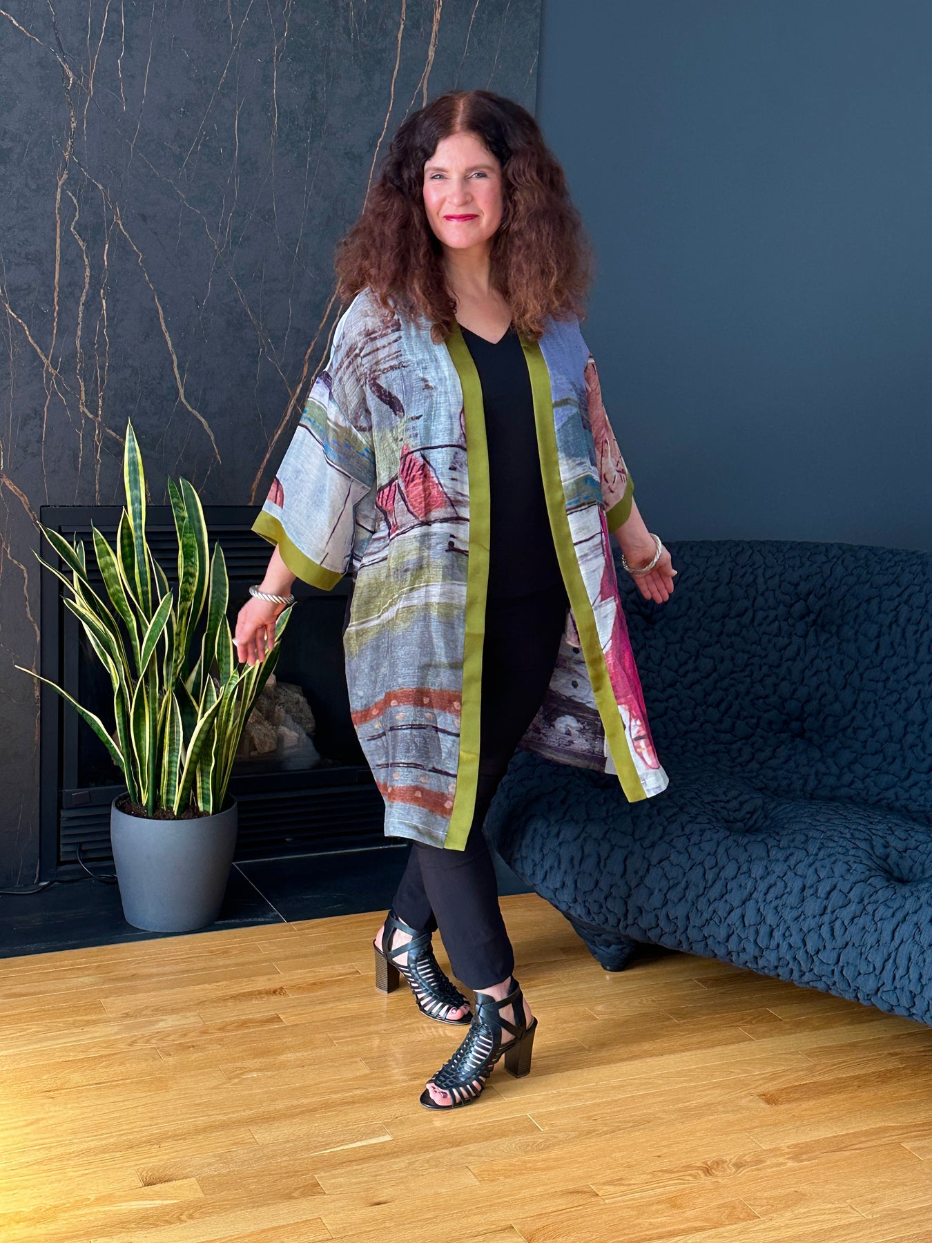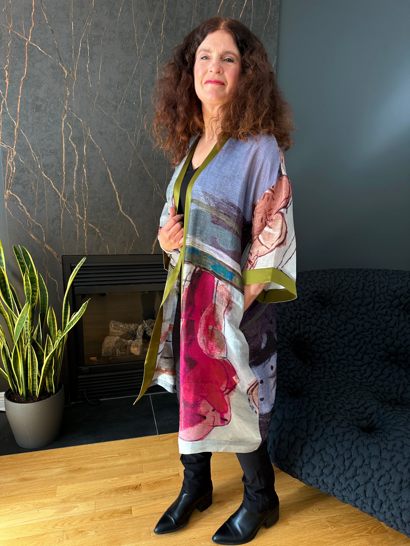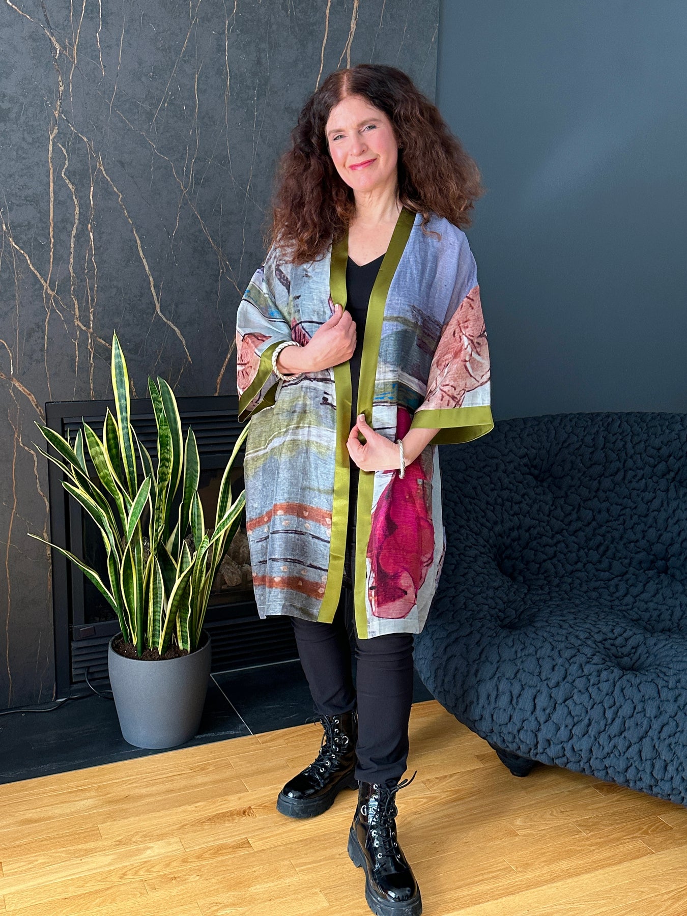 D-489C KIMONO - LET RIGHTEOUSNESS AND PRAISE SPRING UP - WITH OLIVE GREEN SILK TRIM