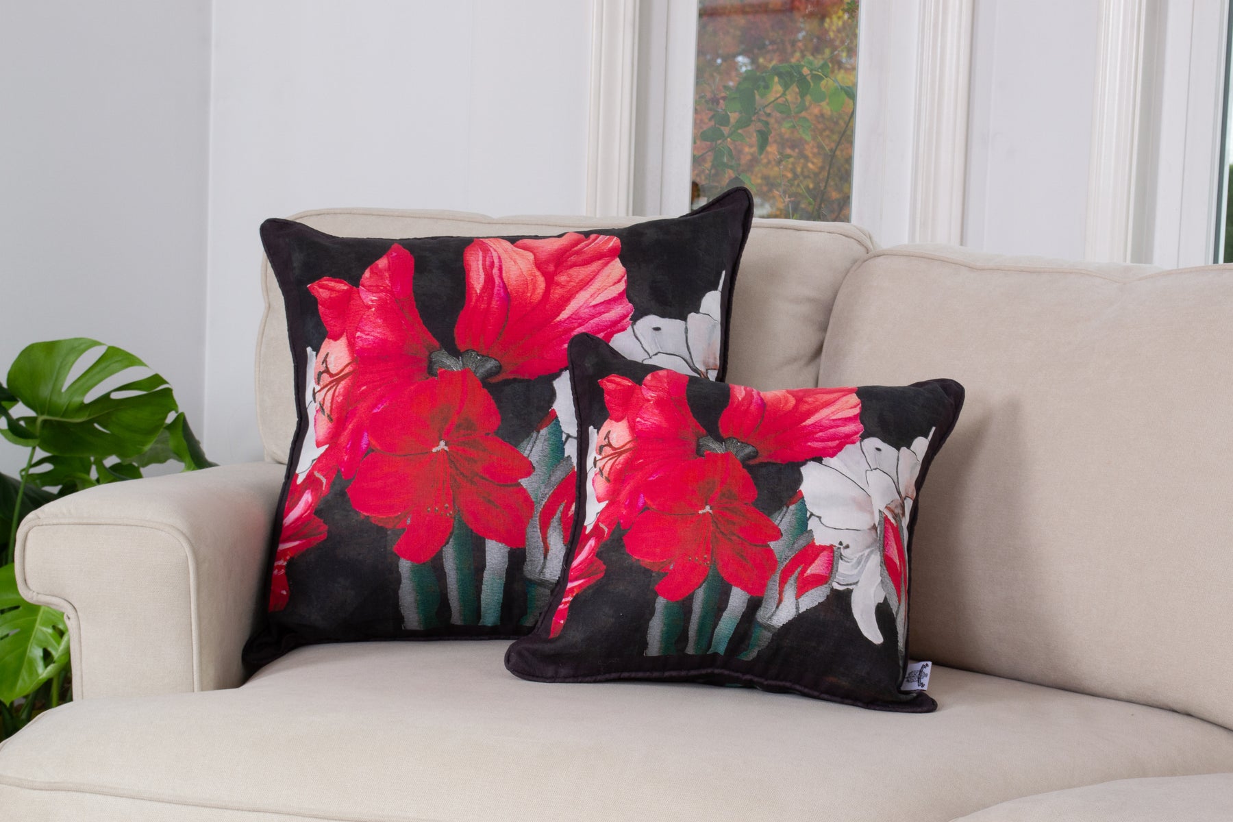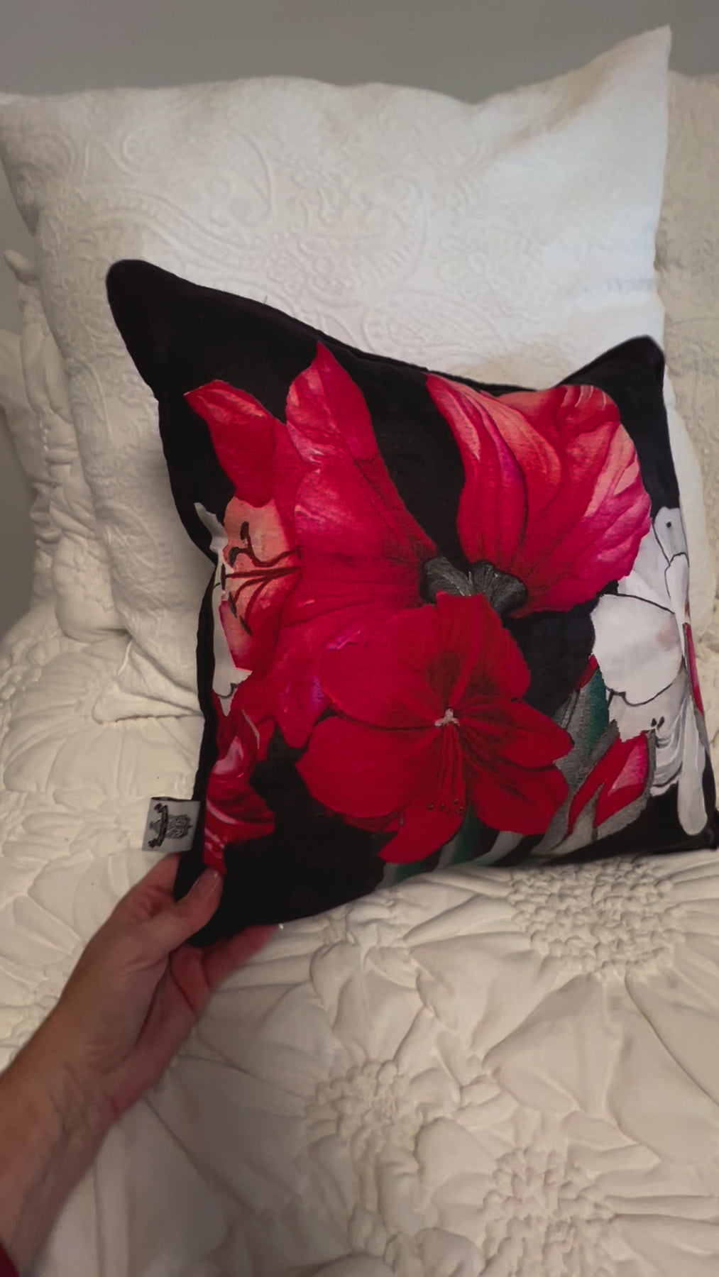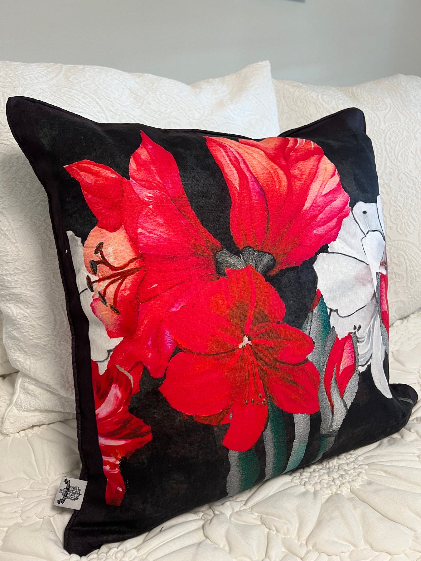 D-192 AMARYLLIS BLOOM - Small Luxury Hand Painted Organic Linen Sham with Black Edge, 16" x 16"