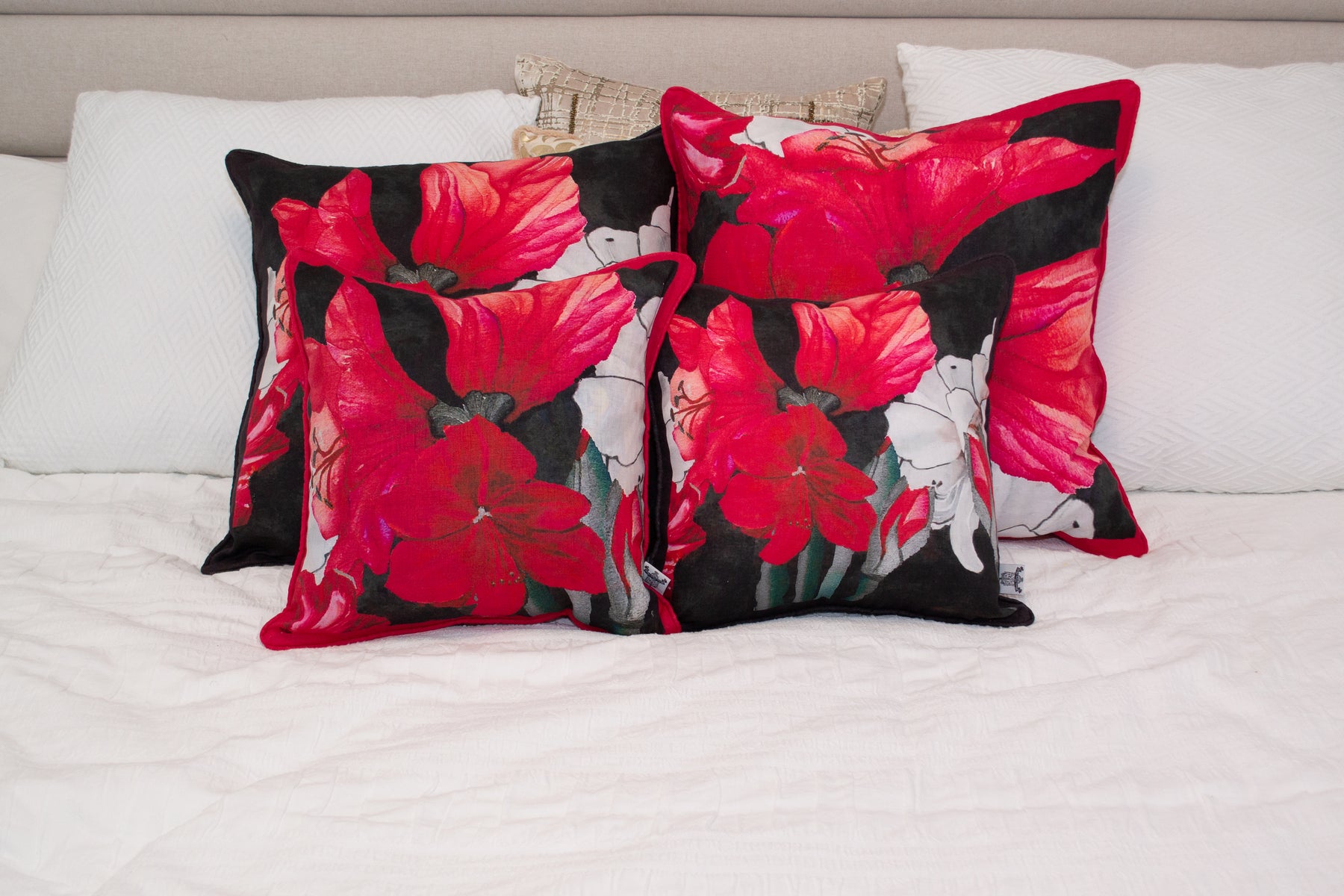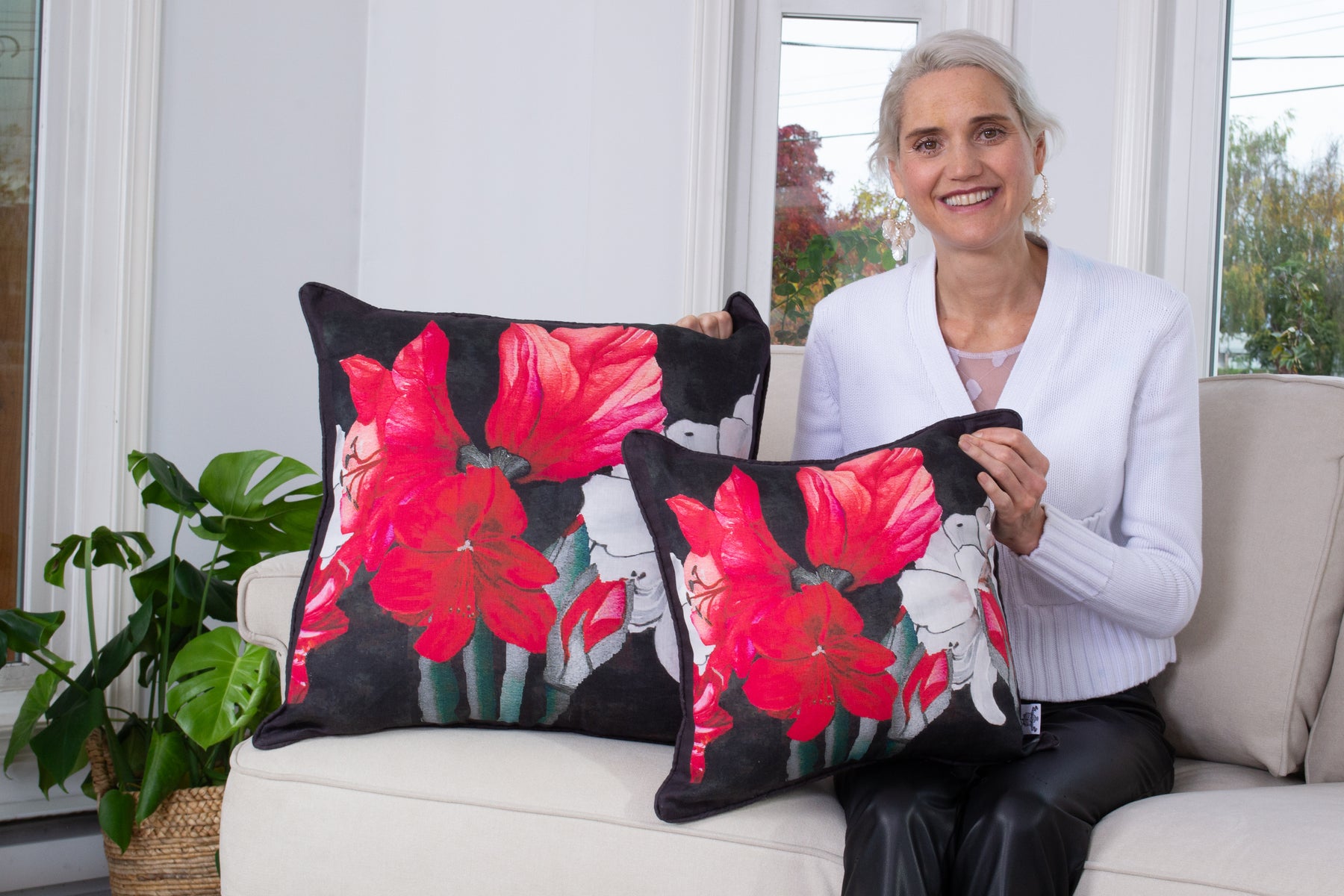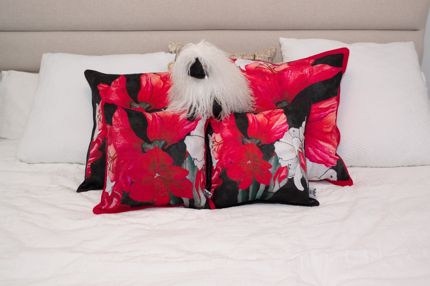 D-192 AMARYLLIS BLOOM - Small Luxury Hand Painted Organic Linen Sham with Black Edge, 16" x 16"