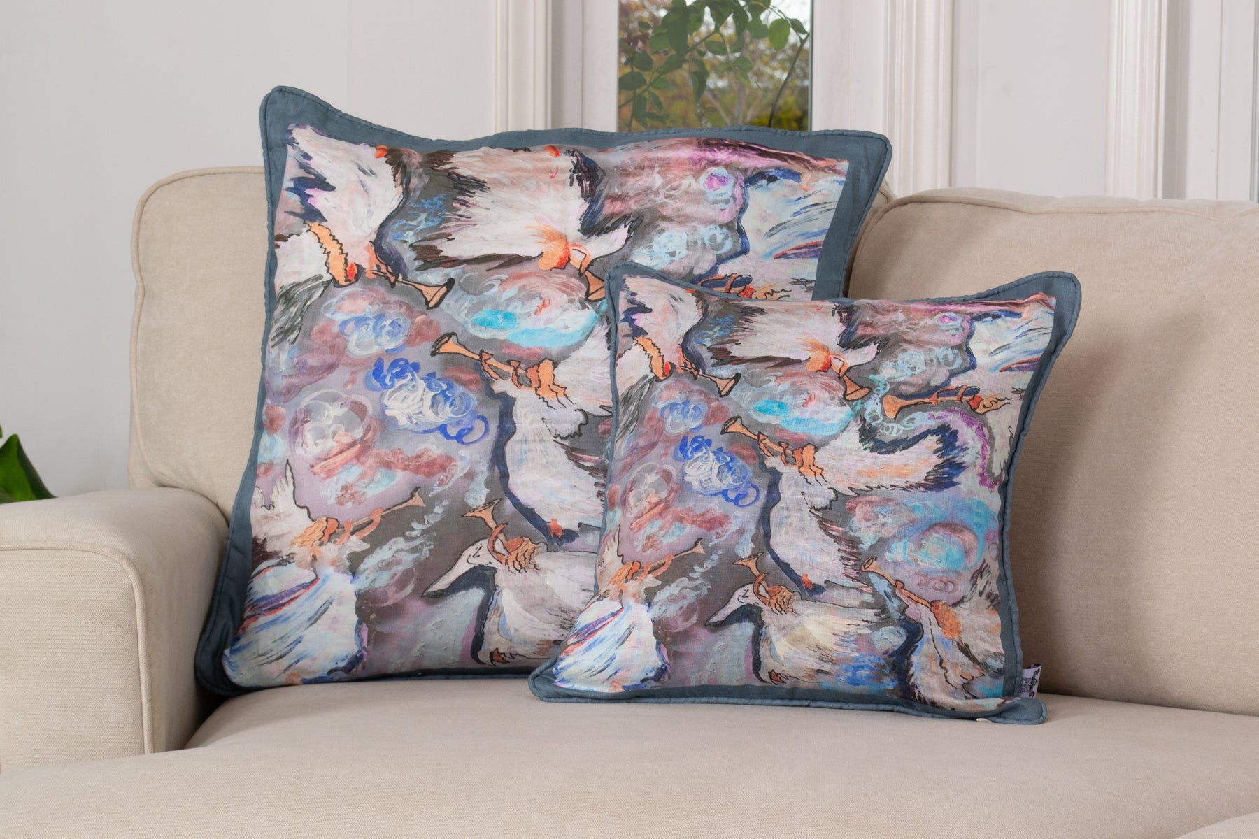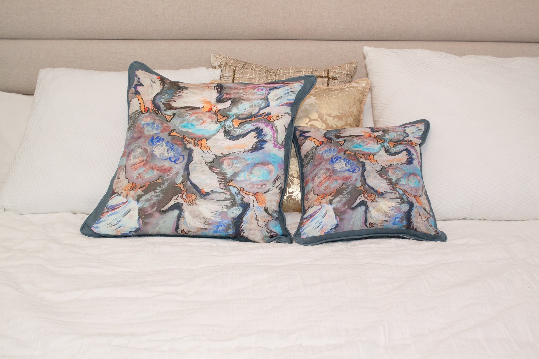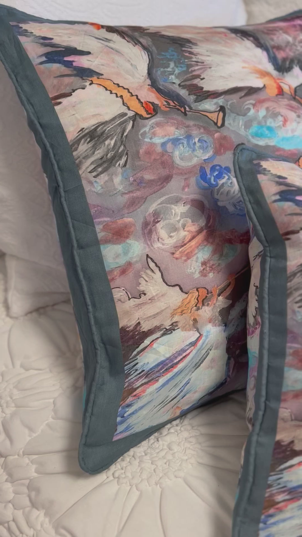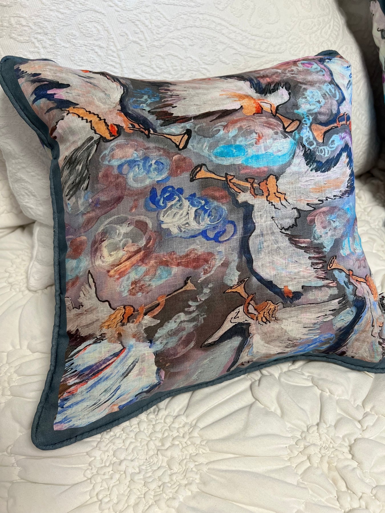 D-353 SEVEN ANGELS WITH SEVEN TRUMPETS- Large Luxury Hand Painted Organic Linen Sham 22" x 22"