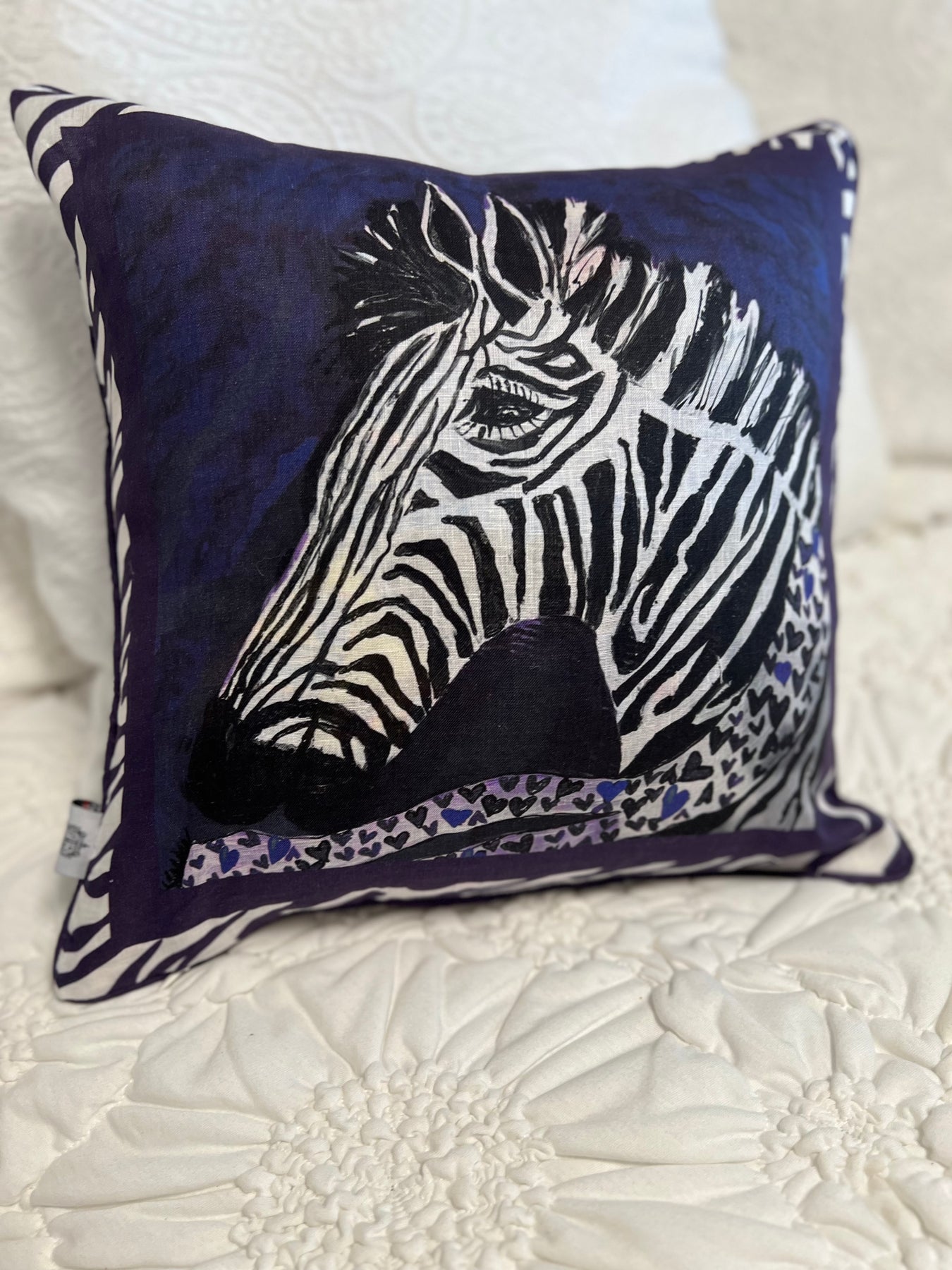 D-373 HEALING STRIPES - BLUE ZEBRA - Small Luxury Hand Painted Organic Linen Sham , 16" x 16"
