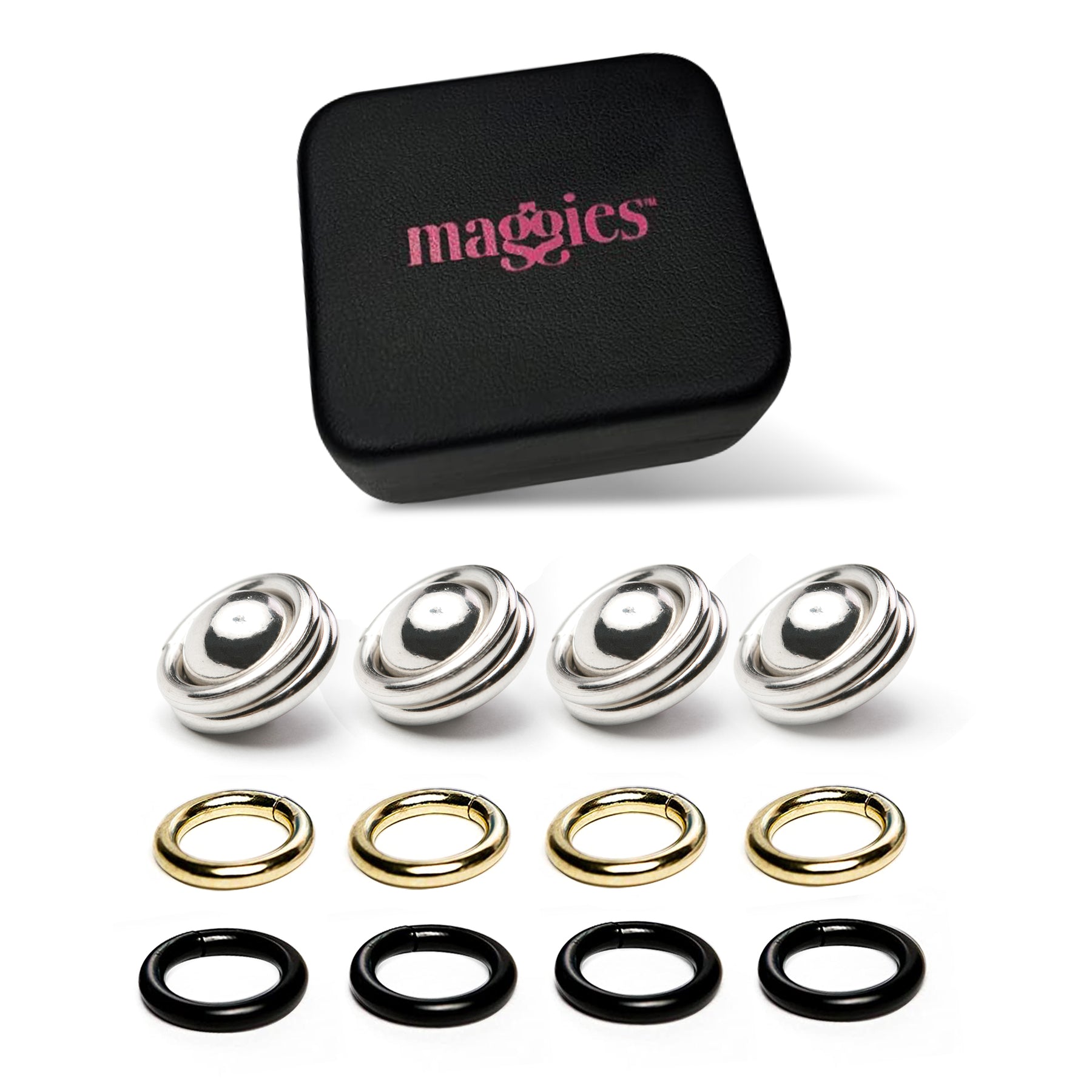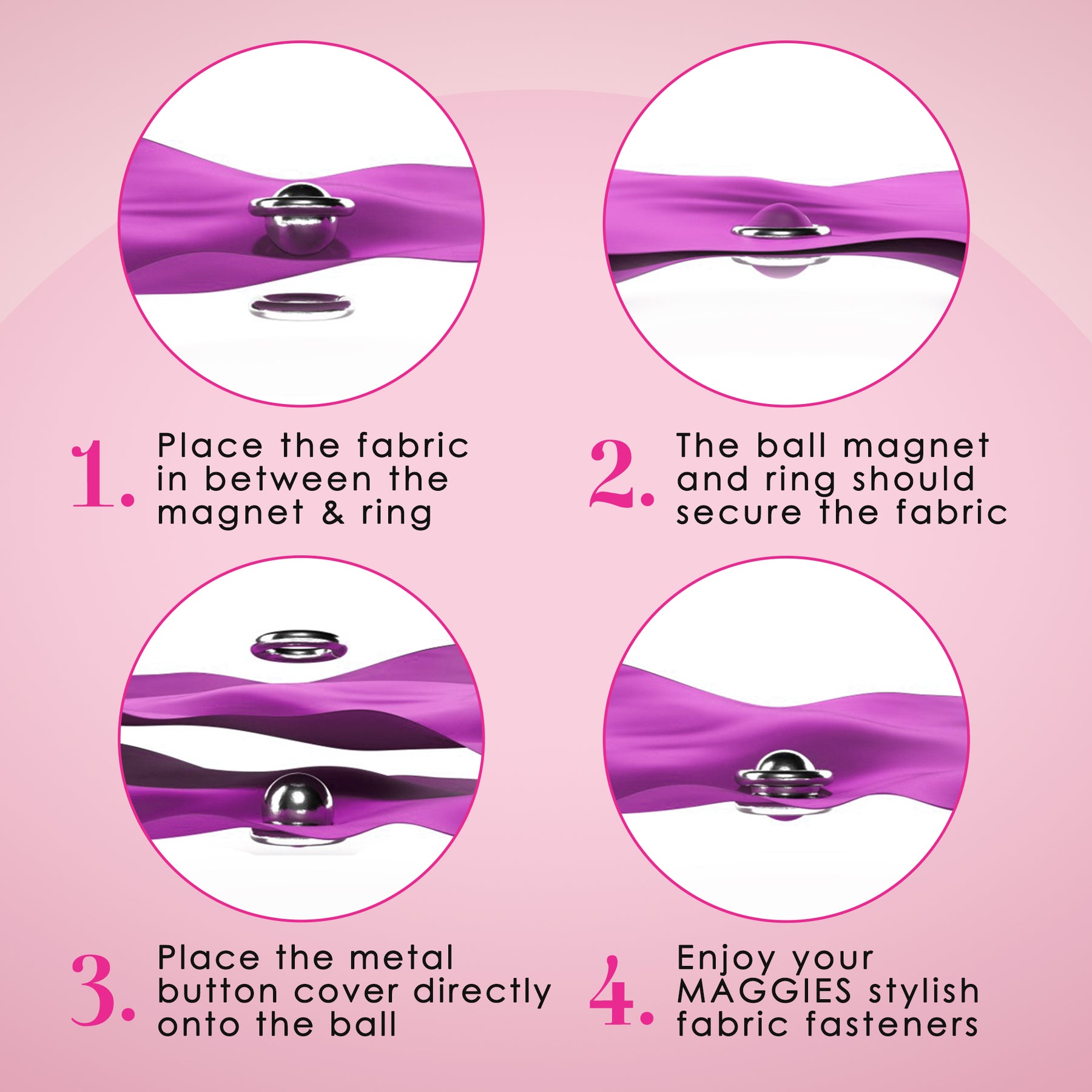 A Maggie is a powerful ball and ring magnet designed to securely fasten your fabrics together without pins or knots.