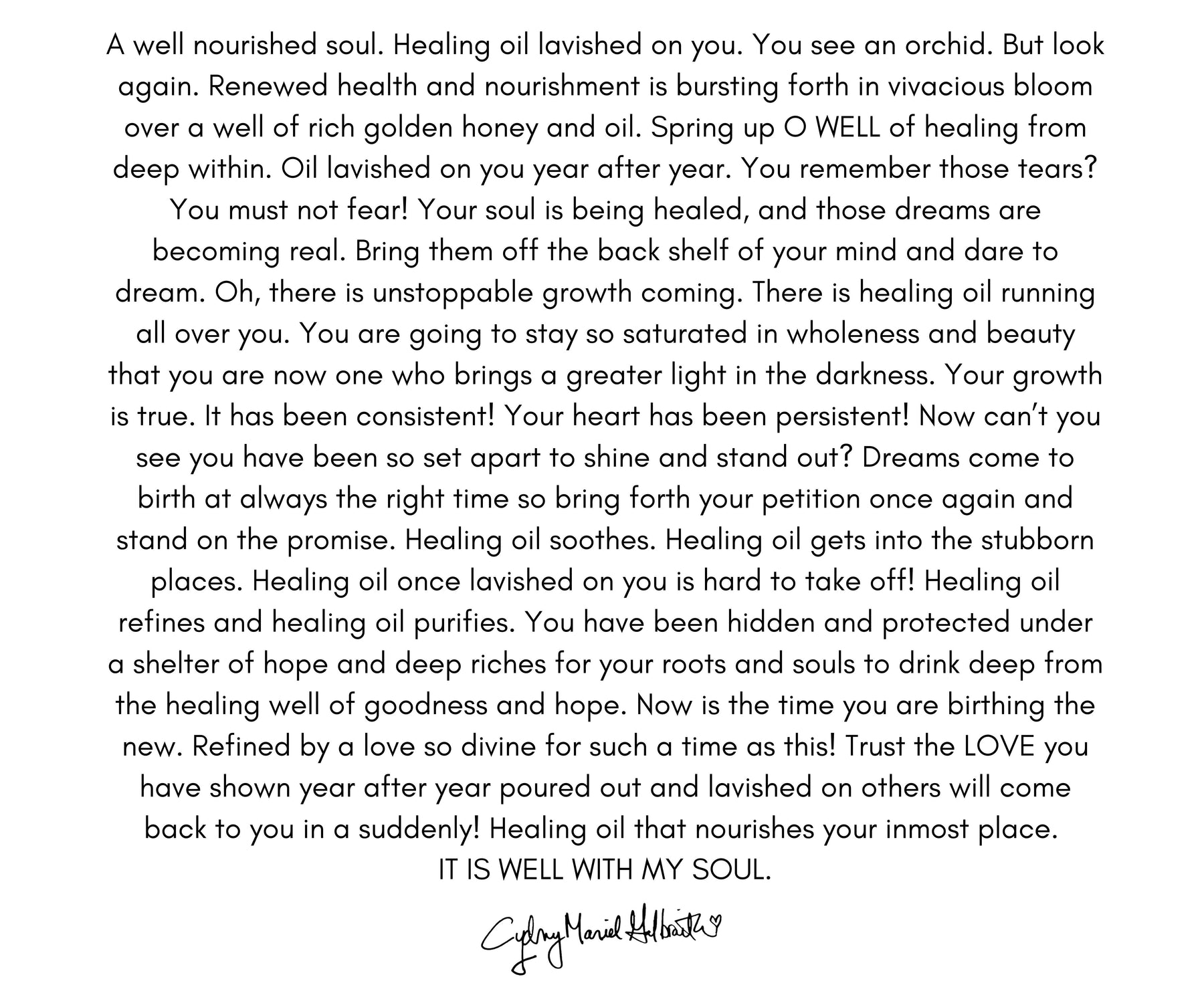 A well nourished soul. Healing oil lavished on you. You see an orchid. But look again. Renewed health and nourishment is bursting forth in vivacious bloom over a well of rich golden honey and oil. Spring up O WELL of healing from deep within. Oil lavished on you year after year. You remember those tears? You must not fear! Your soul is being healed, and those dreams are becoming real. Bring them off the back shelf of your mind and dare to dream. Oh, there is unstoppable growth coming. There is healing oil running all over you. You are going to stay so saturated in wholeness and beauty that you are now one who brings a greater light in the darkness. Your growth is true. It has been consistent! Your heart has been persistent! Now can’t you see you have been so set apart to shine and stand out? Dreams come to birth at always the right time so bring forth your petition once again and stand on the promise. Healing oil soothes. Healing oil gets into the stubborn places. Healing oil once lavished on you is hard to take off! Healing oil refines and healing oil purifies. You have been hidden and protected under a shelter of hope and deep riches for your roots and souls to drink deep from the healing well of goodness and hope. Now is the time you are birthing the new. Refined by a love so divine for such a time as this! Trust the LOVE you have shown year after year poured out and lavished on others will come back to you in a suddenly! Healing oil that nourishes your inmost place. IT IS WELL WITH MY SOUL.