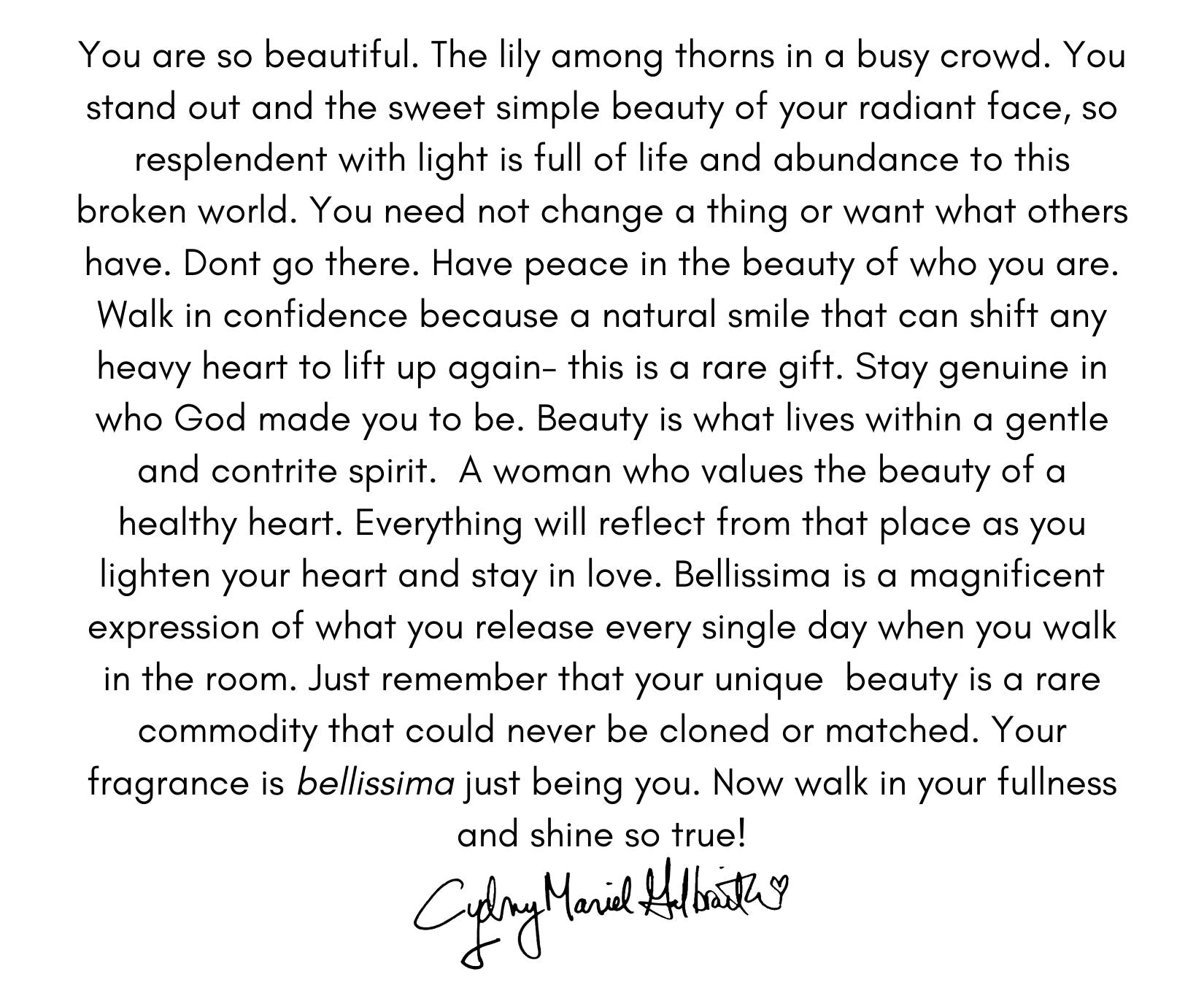 You are so beautiful. The lily among thorns in a busy crowd. You stand out and the sweet simple beauty of your radiant face, so resplendent with light is full of life and abundance to this broken world. You need not change a thing or want what others have. Dont go there. Have peace in the beauty of who you are. Walk in confidence because a natural smile that can shift any heavy heart to lift up again- this is a rare gift. Stay genuine in who God made you to be. Beauty is what lives within a gentle and contrite spirit. A woman who values the beauty of a healthy heart. Everything will reflect from that place as you lighten your heart and stay in love. Bellissima is a magnificent expression of what you release every single day when you walk in the room. Just remember that your unique beauty is a rare commodity that could never be cloned or matched. Your fragrance is bellissima just being you. Now walk in your fullness and shine so true!