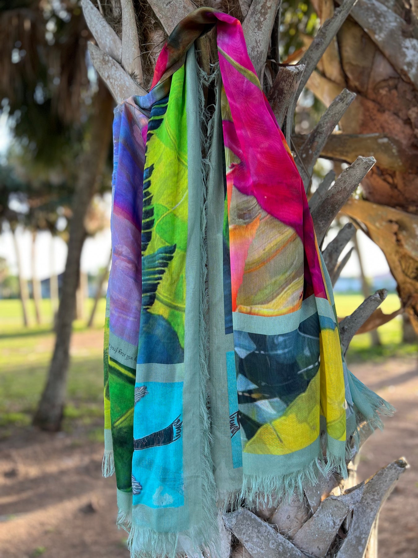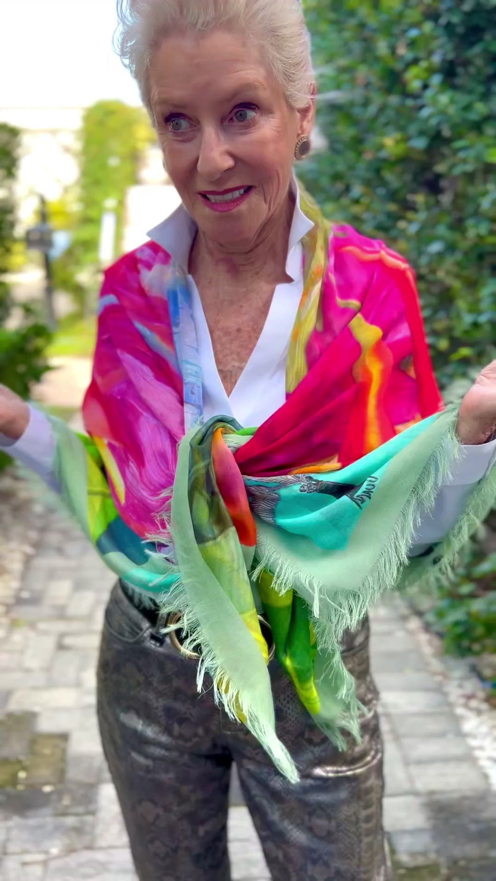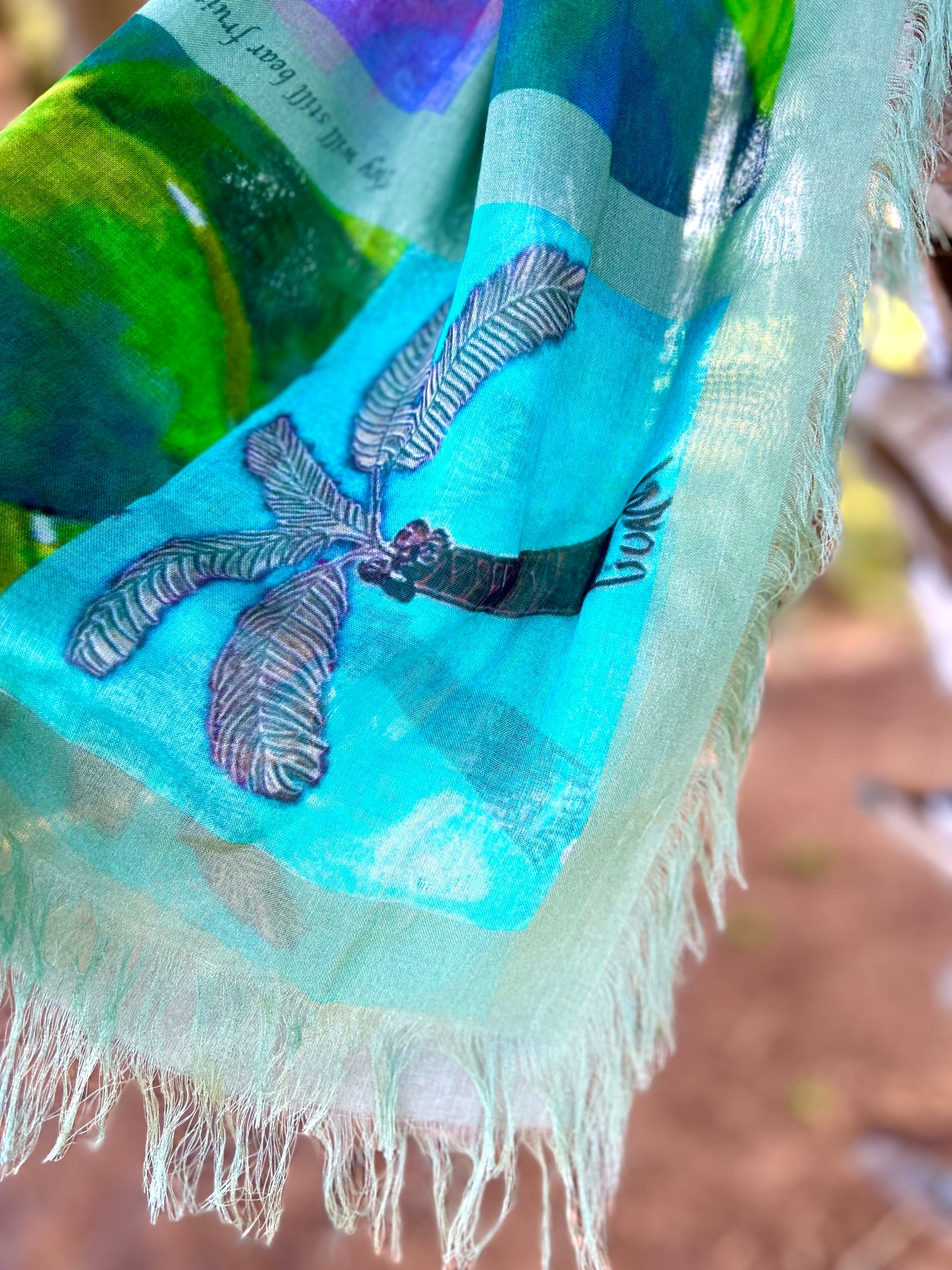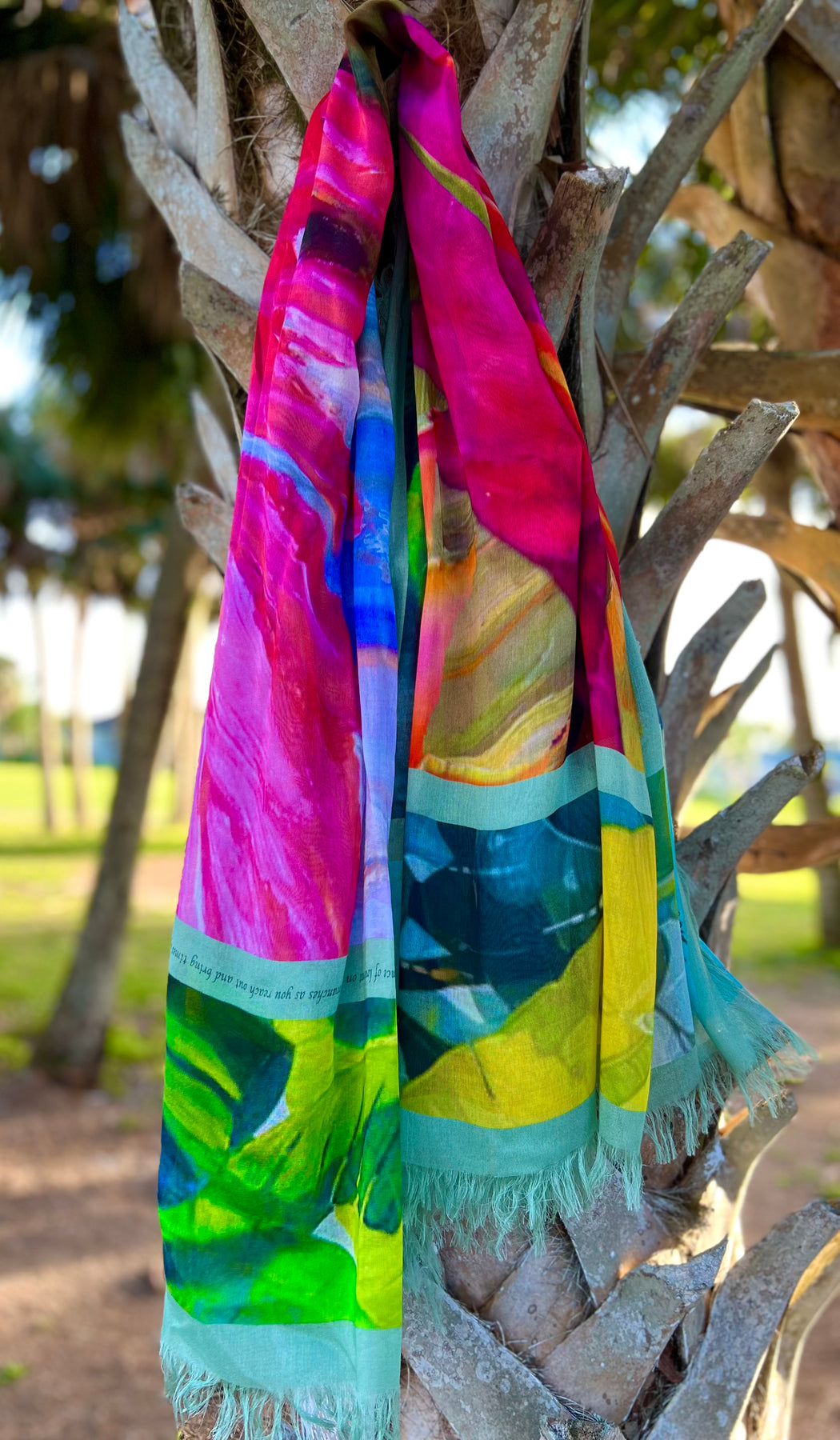Please note. This scarf we had a minor print error. The words are printed on the muted side. Not noticable, but thank you for your grace and understanding. Still same scarf love and quality, just words on the more muted side of the scarf.