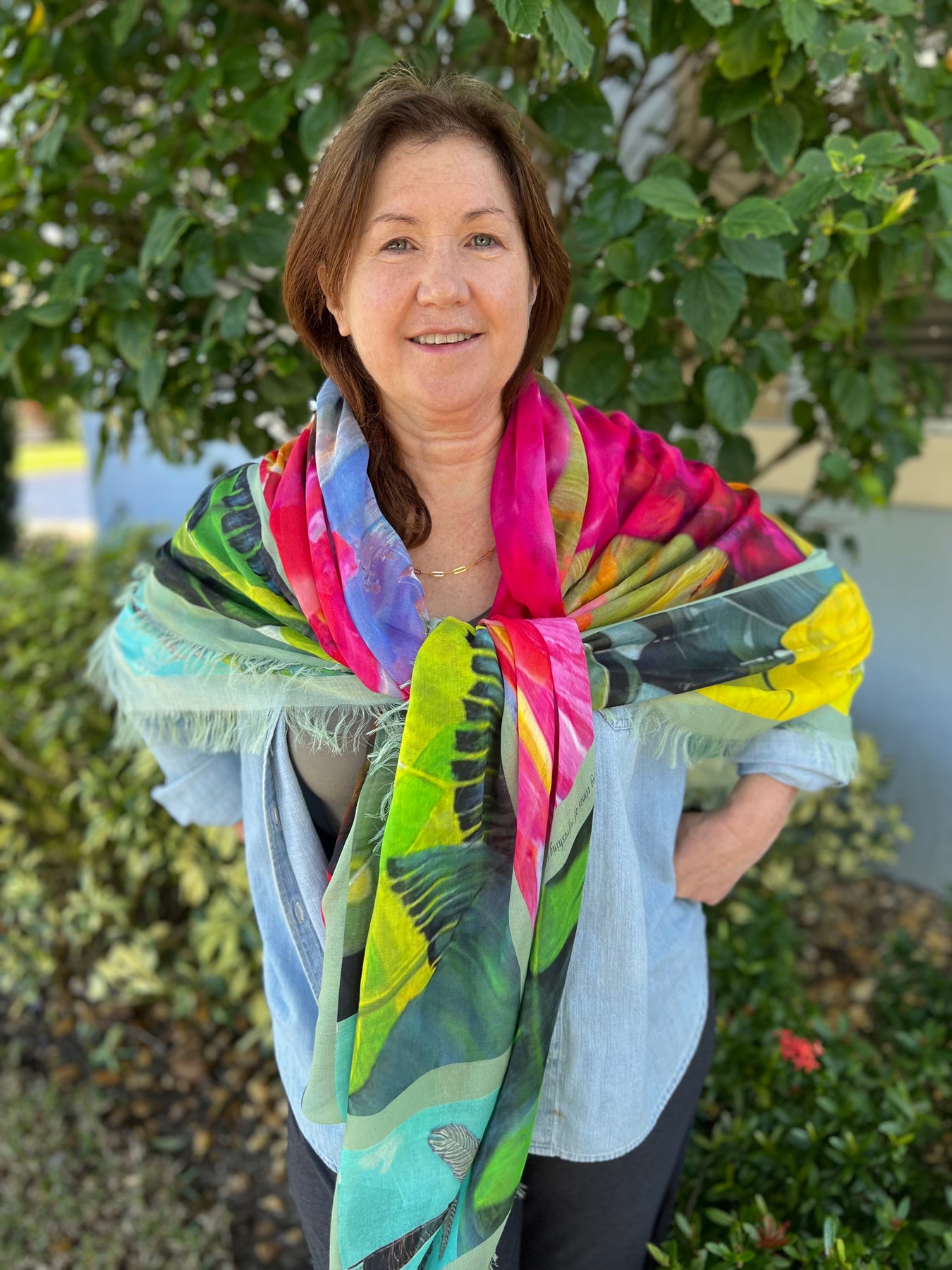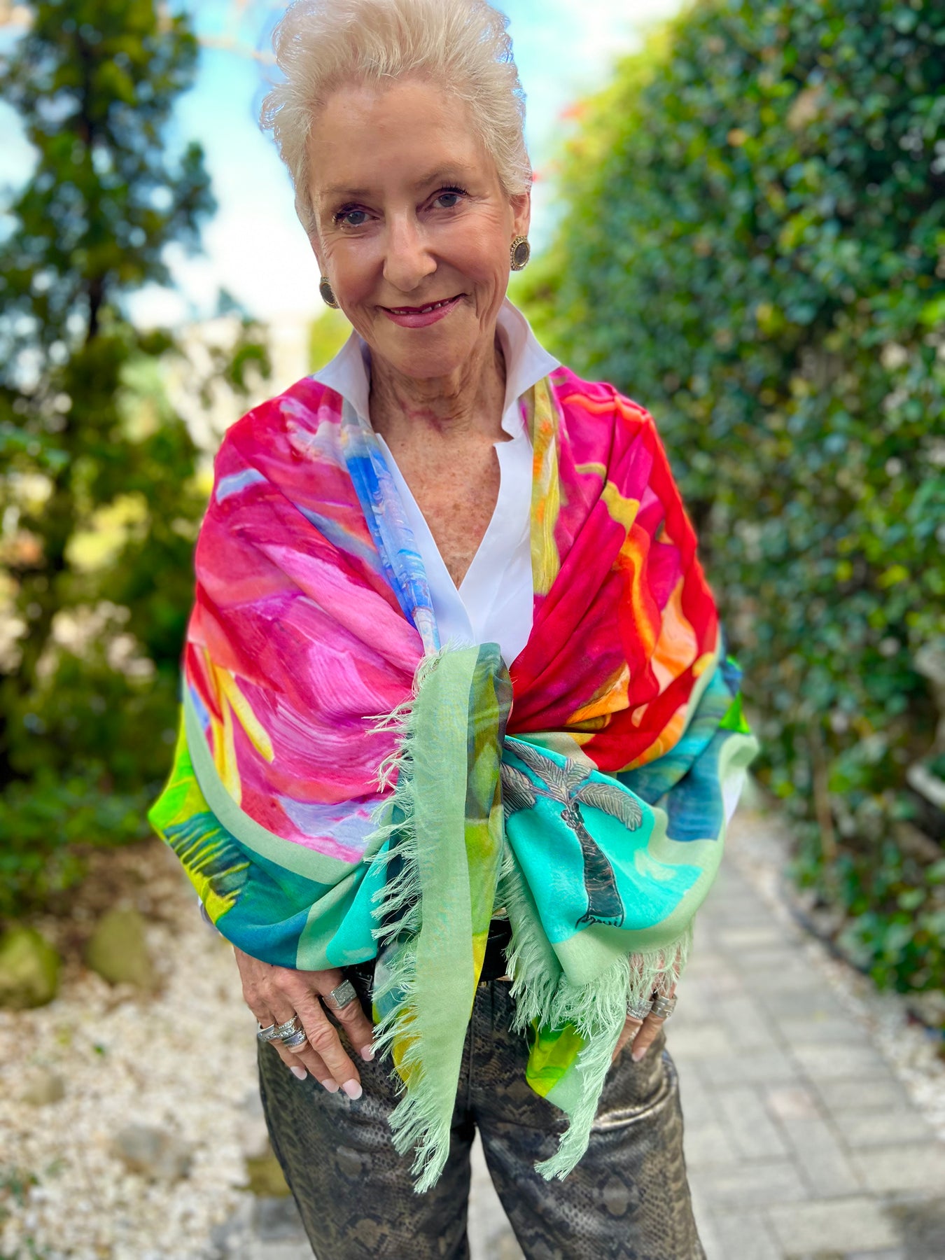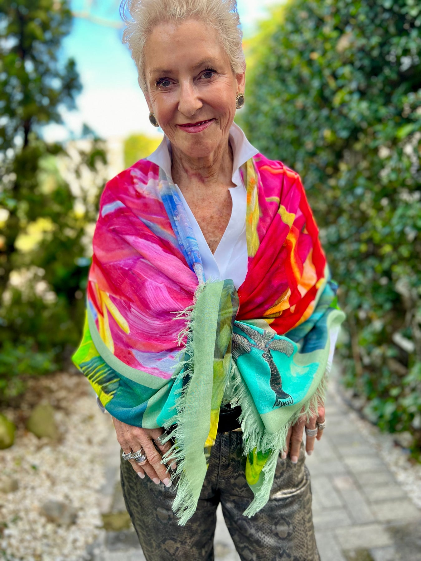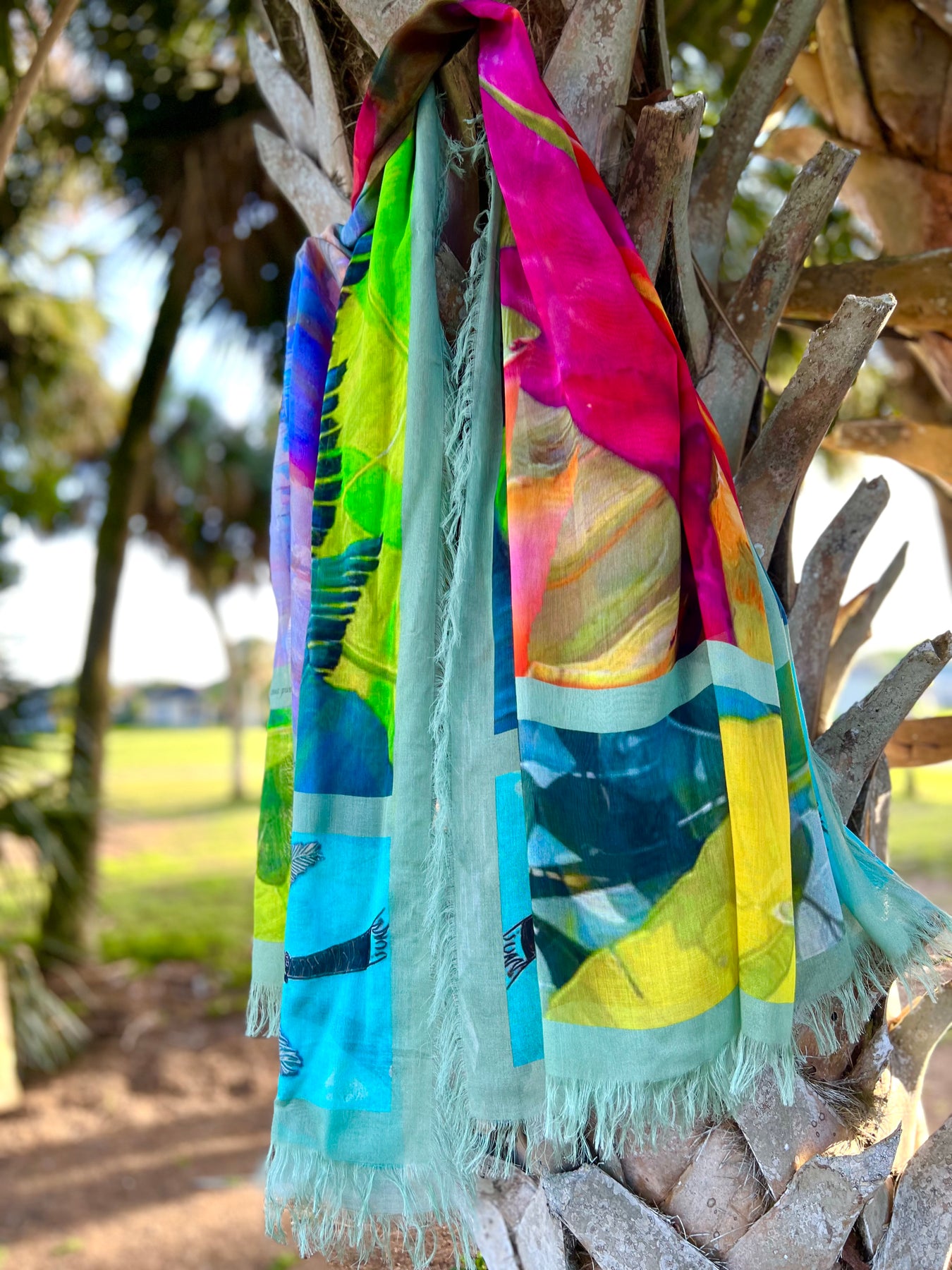 Please note. This scarf we had a minor print error. The words are printed on the muted side. Not noticable, but thank you for your grace and understanding. Still same scarf love and quality, just words on the more muted side of the scarf.
