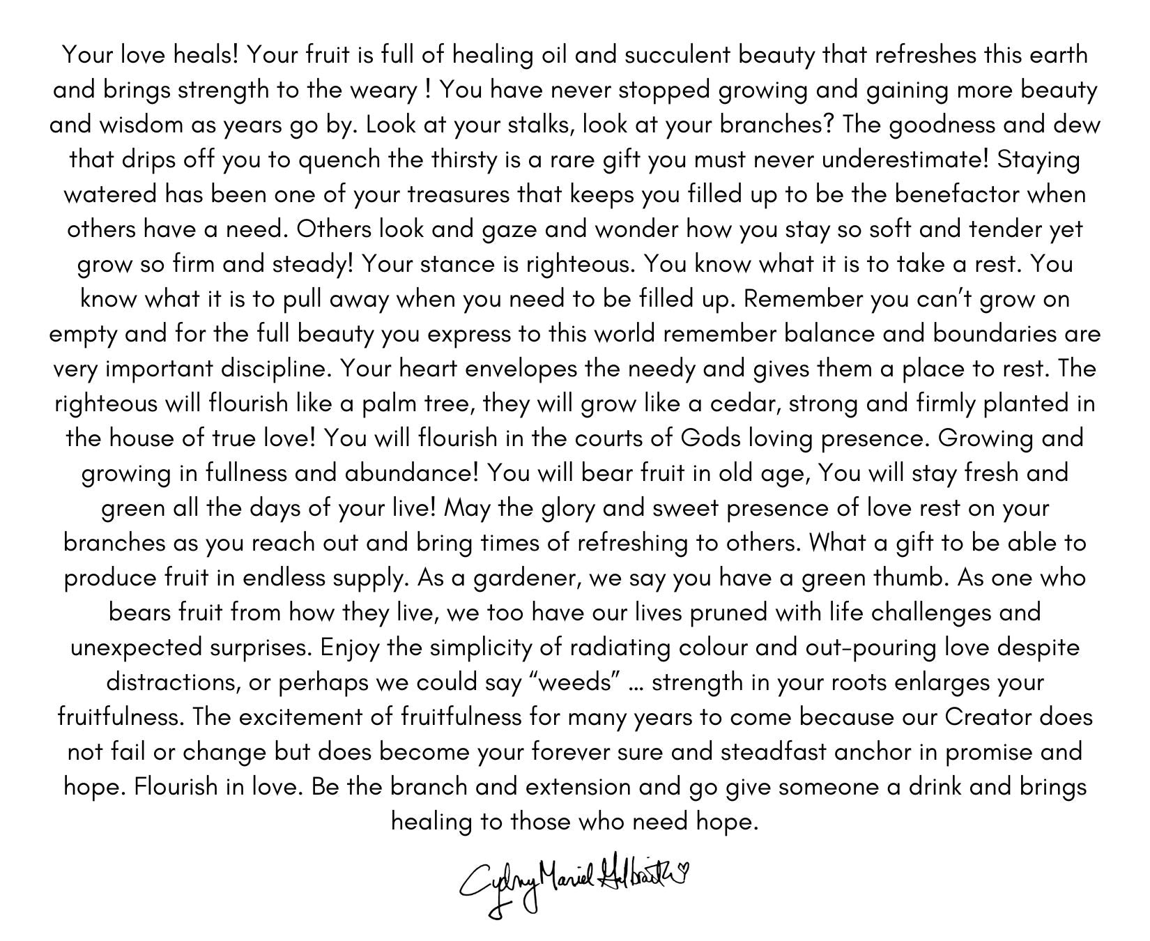 Your love heals! Your fruit is full of healing oil and succulent beauty that refreshes this earth and brings strength to the weary ! You have never stopped growing and gaining more beauty and wisdom as years go by. Look at your stalks, look at your branches? The goodness and dew that drips off you to quench the thirsty is a rare gift you must never underestimate! Staying watered has been one of your treasures that keeps you filled up to be the benefactor when others have a need. Others look and gaze and wonder how you stay so soft and tender yet grow so firm and steady! Your stance is righteous. You know what it is to take a rest. You know what it is to pull away when you need to be filled up. Remember you can’t grow on empty and for the full beauty you express to this world remember balance and boundaries are very important discipline. Your heart envelopes the needy and gives them a place to rest. The righteous will flourish like a palm tree, they will grow like a cedar, strong and firmly planted in the house of true love! You will flourish in the courts of Gods loving presence. Growing and growing in fullness and abundance! You will bear fruit in old age, You will stay fresh and green all the days of your live! May the glory and sweet presence of love rest on your branches as you reach out and bring times of refreshing to others. What a gift to be able to produce fruit in endless supply. As a gardener, we say you have a green thumb. As one who bears fruit from how they live, we too have our lives pruned with life challenges and unexpected surprises. Enjoy the simplicity of radiating colour and out-pouring love despite distractions, or perhaps we could say “weeds” … strength in your roots enlarges your fruitfulness. The excitement of fruitfulness for many years to come because our Creator does not fail or change but does become your forever sure and steadfast anchor in promise and hope. Flourish in love. Be the branch and extension and go give someone a drink and brings healing to those who need hope.