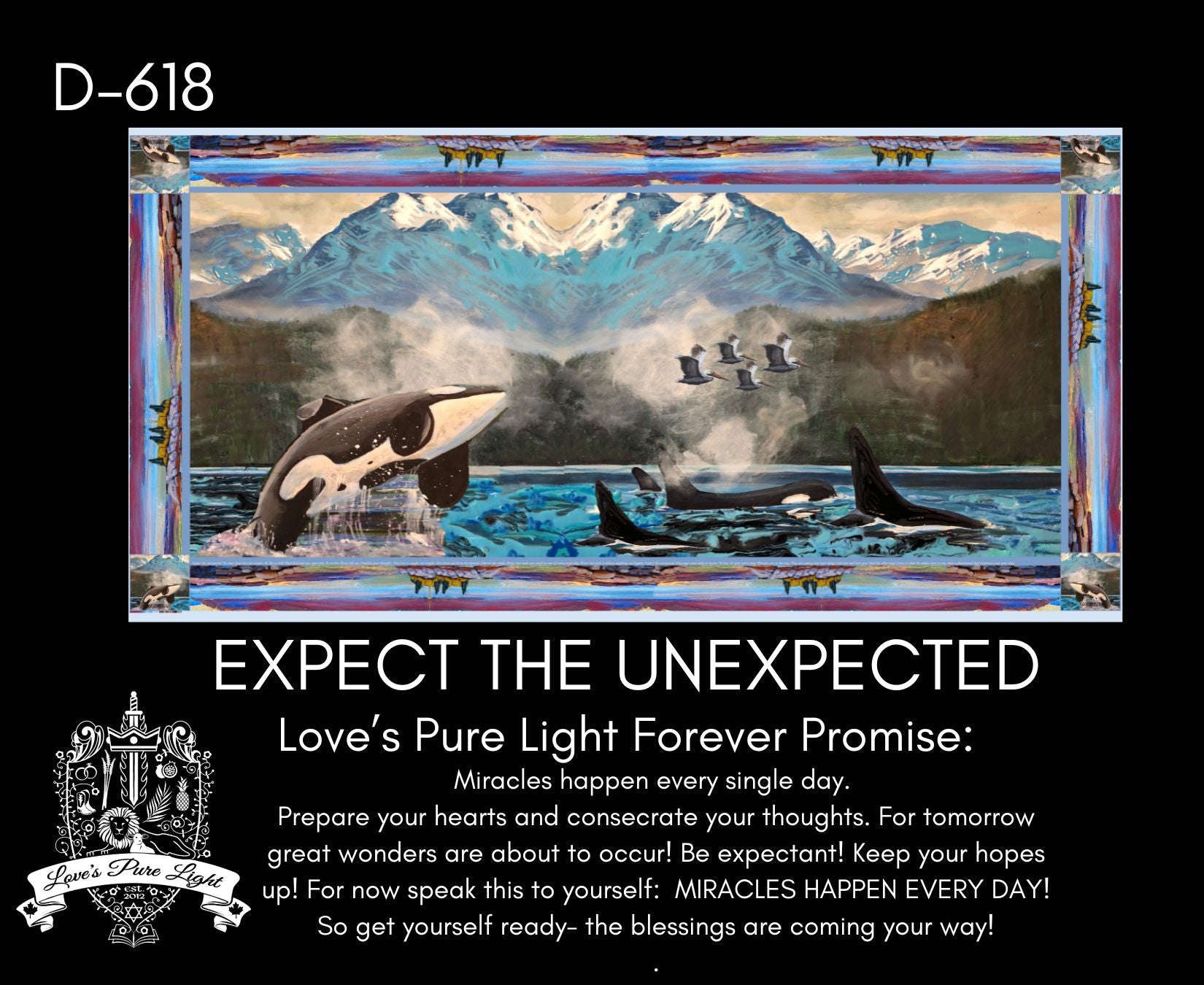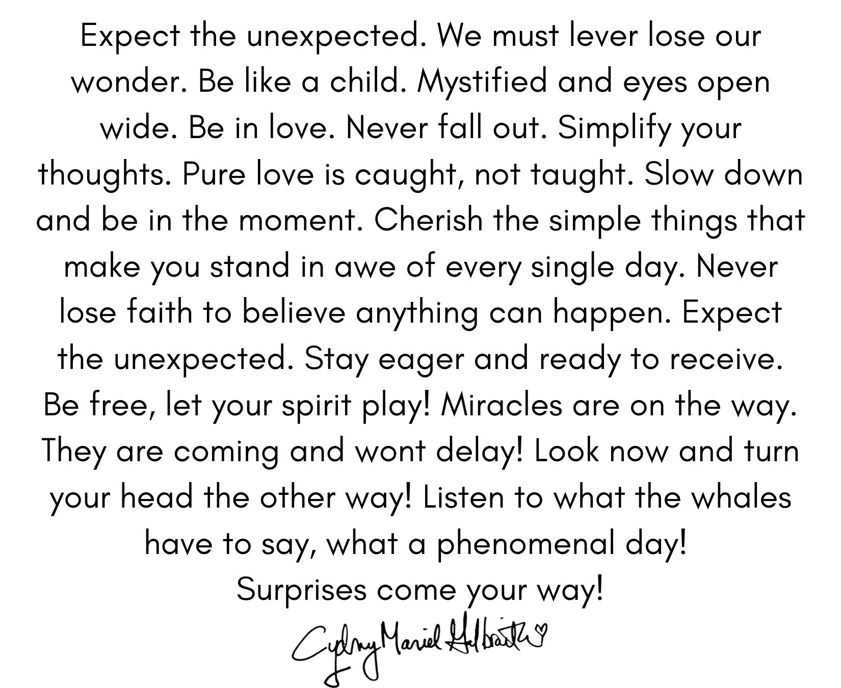 Expect the unexpected. We must lever lose our wonder. Be like a child. Mystified and eyes open wide. Be in love. Never fall out. Simplify your thoughts. Pure love is caught, not taught. Slow down and be in the moment. Cherish the simple things that make you stand in awe of every single day. Never lose faith to believe anything can happen. Expect the unexpected. Stay eager and ready to receive. Be free, let your spirit play! Miracles are on the way. They are coming and wont delay! Look now and turn your head the other way! Listen to what the whales have to say, what a phenomenal day! Surprises come your way!