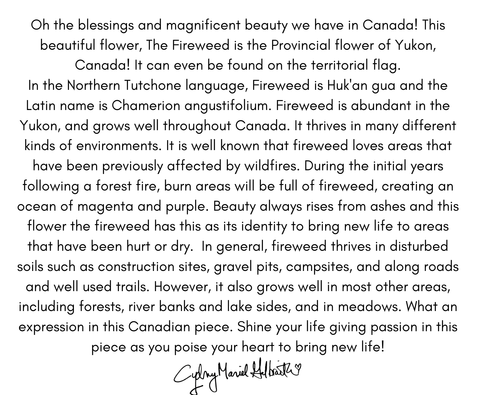 In the Northern Tutchone language, Fireweed is Huk'an gua and the Latin name is Chamerion angustifolium. Fireweed is abundant in the Yukon, and grows well throughout Canada. It thrives in many different kinds of environments. It is well known that fireweed loves areas that have been previously affected by wildfires. During the initial years following a forest fire, burn areas will be full of fireweed, creating an ocean of magenta and purple. Beauty always rises from ashes and this flower the fireweed has this as its identity to bring new life to areas that have been hurt or dry. In general, fireweed thrives in disturbed soils such as construction sites, gravel pits, campsites, and along roads and well used trails. However, it also grows well in most other areas, including forests, river banks and lake sides, and in meadows. What an expression in this Canadian piece. Shine your life giving passion in this piece as you poise your heart to bring new life!