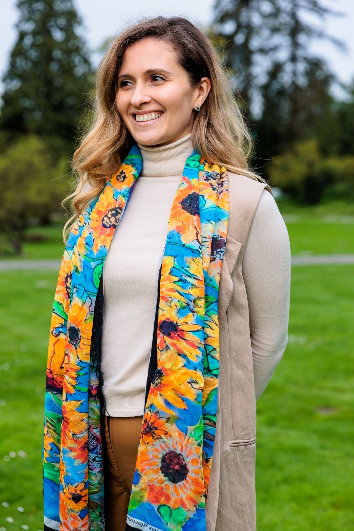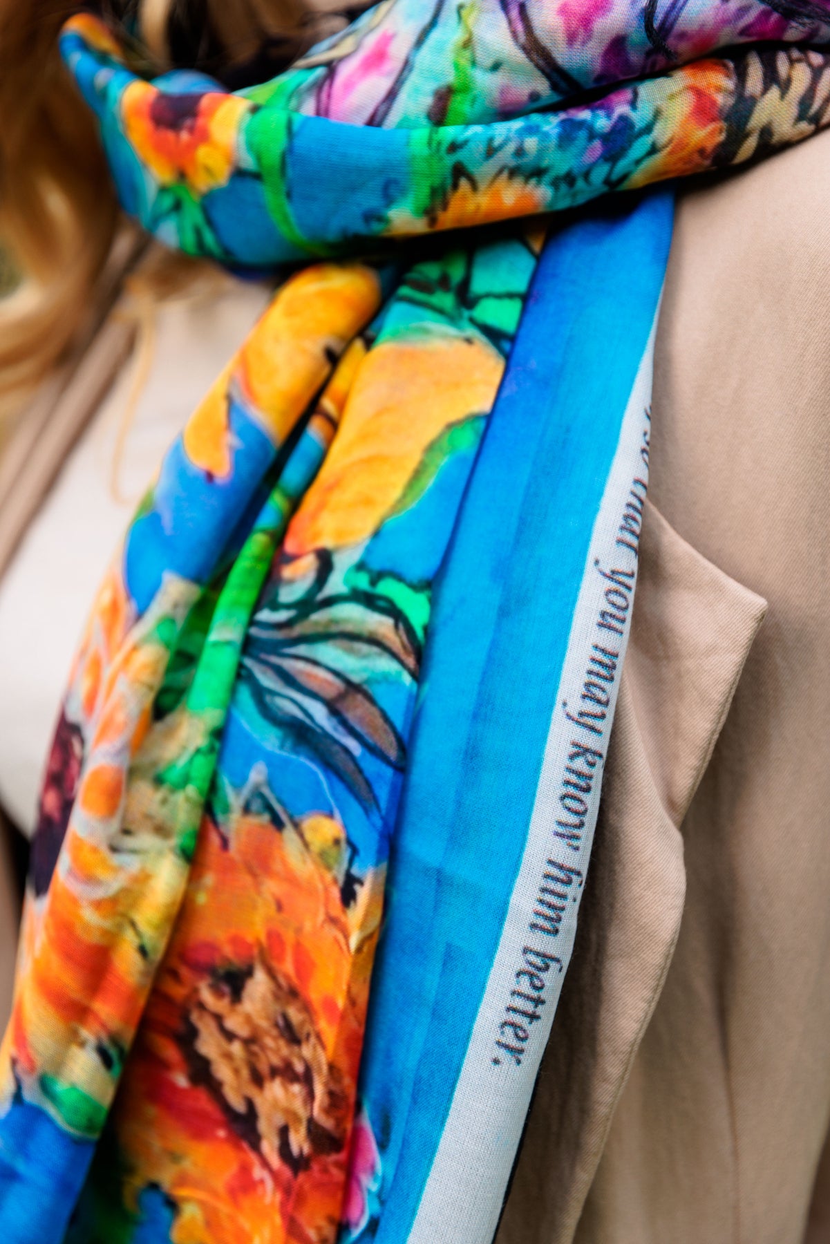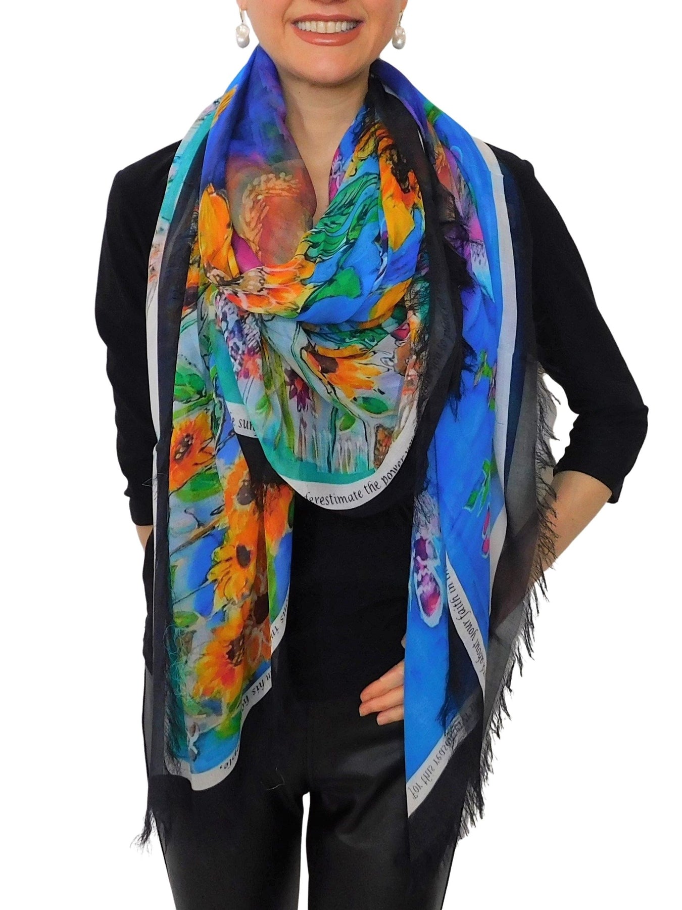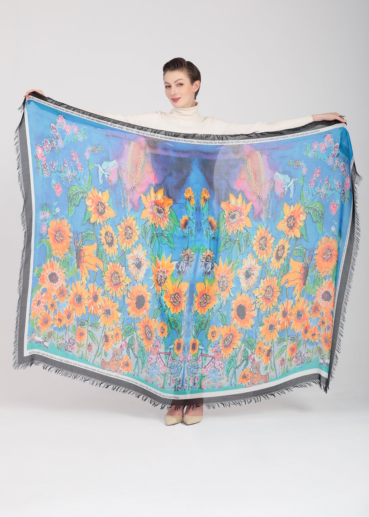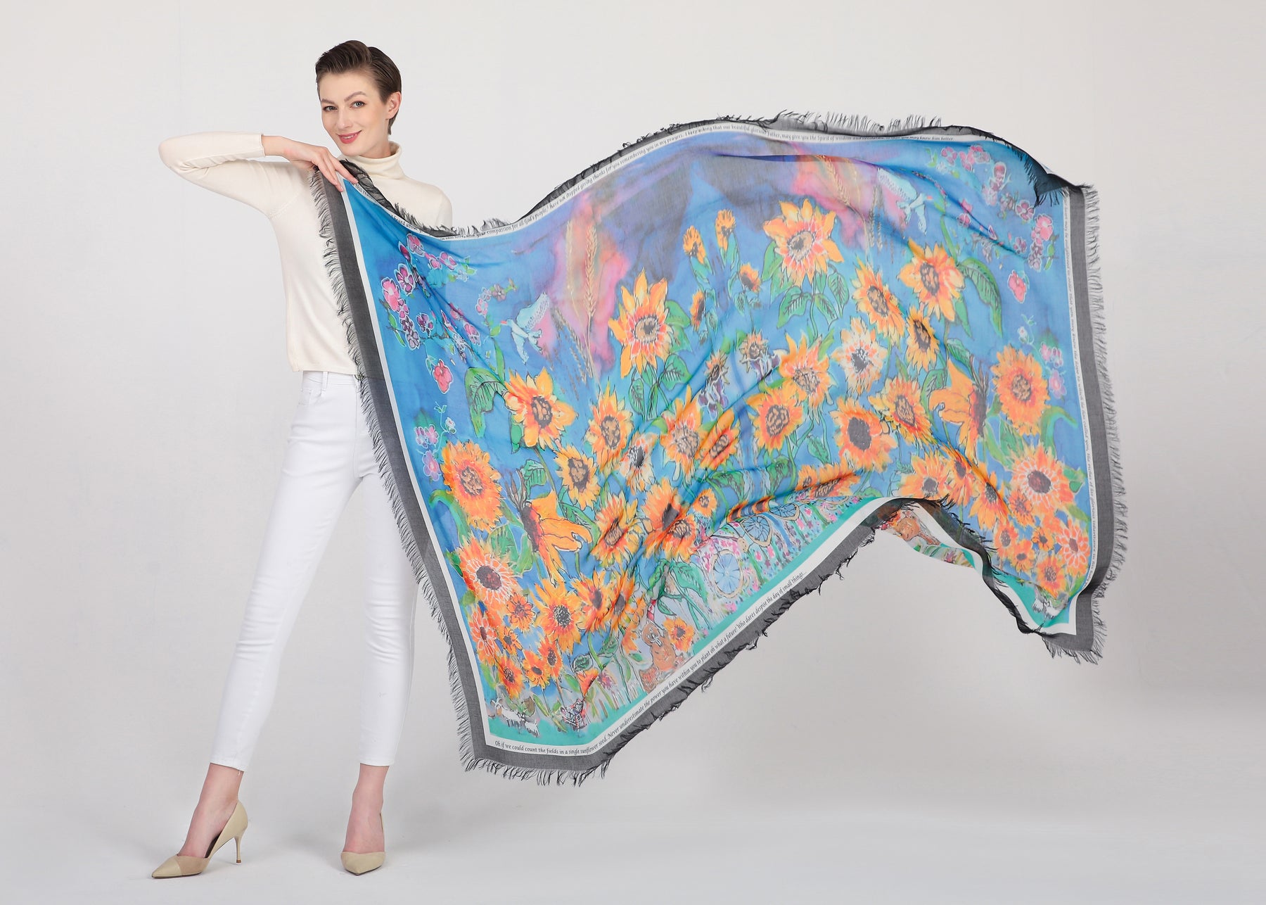 The sunflower scarf D-124A is called GLORIOUS INHERITANCE with a wonderful blessing for the world right now specifically Ukraine. It serves as a lovely prayer shawl for Ukraine and has a lovely blessing inscribed on this scarf. The proceeds will be sown back to the very people of Ukraine.