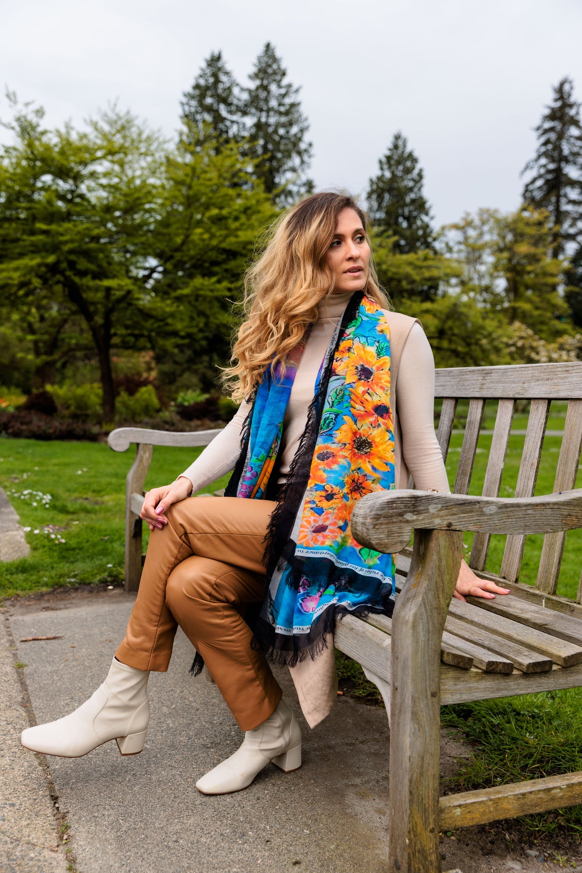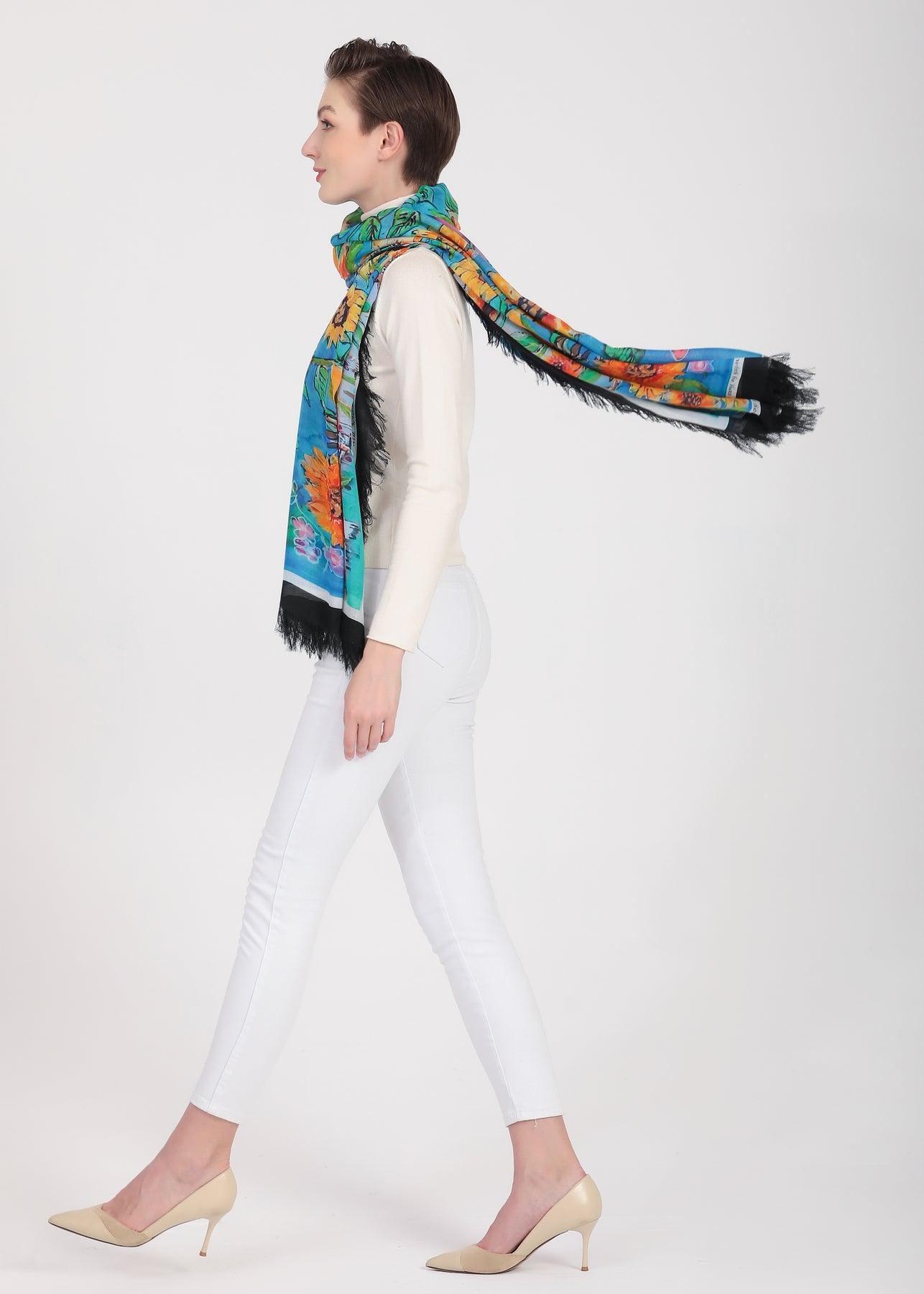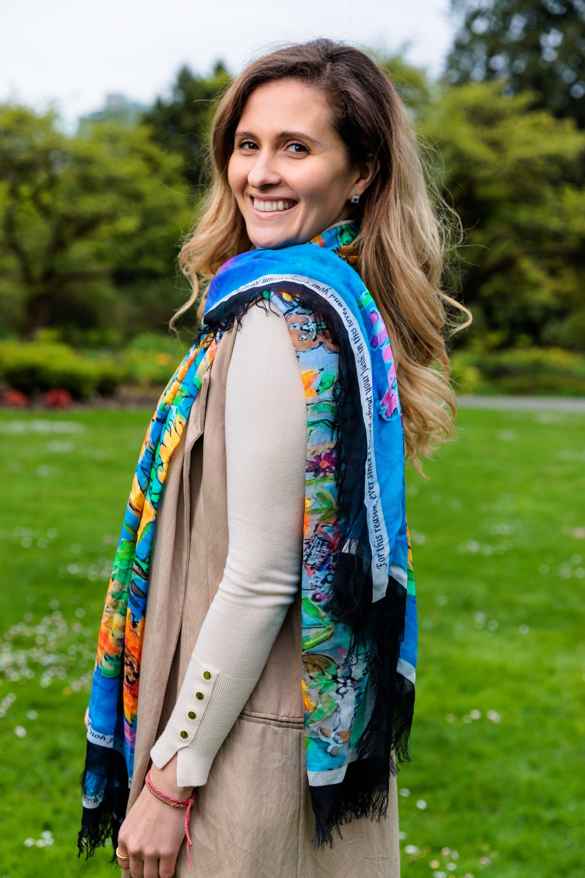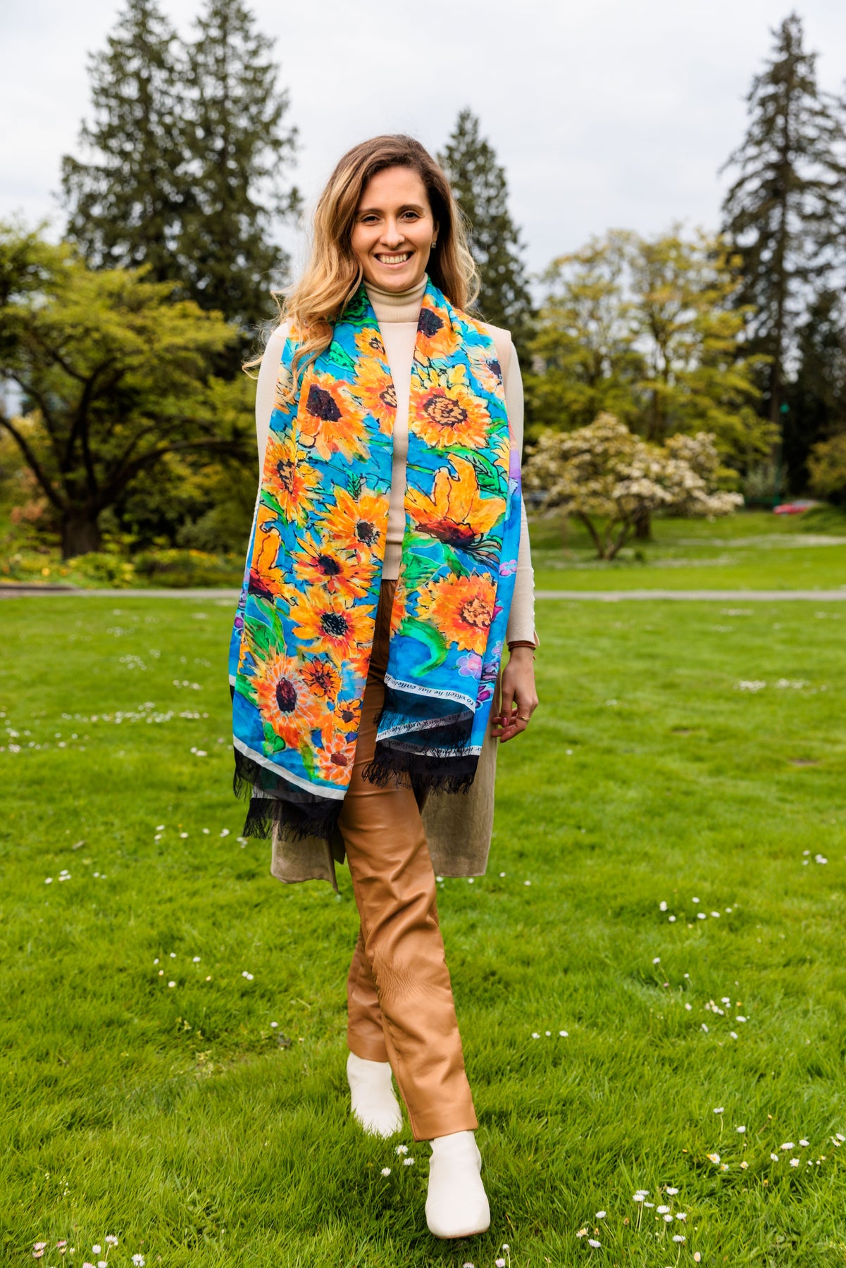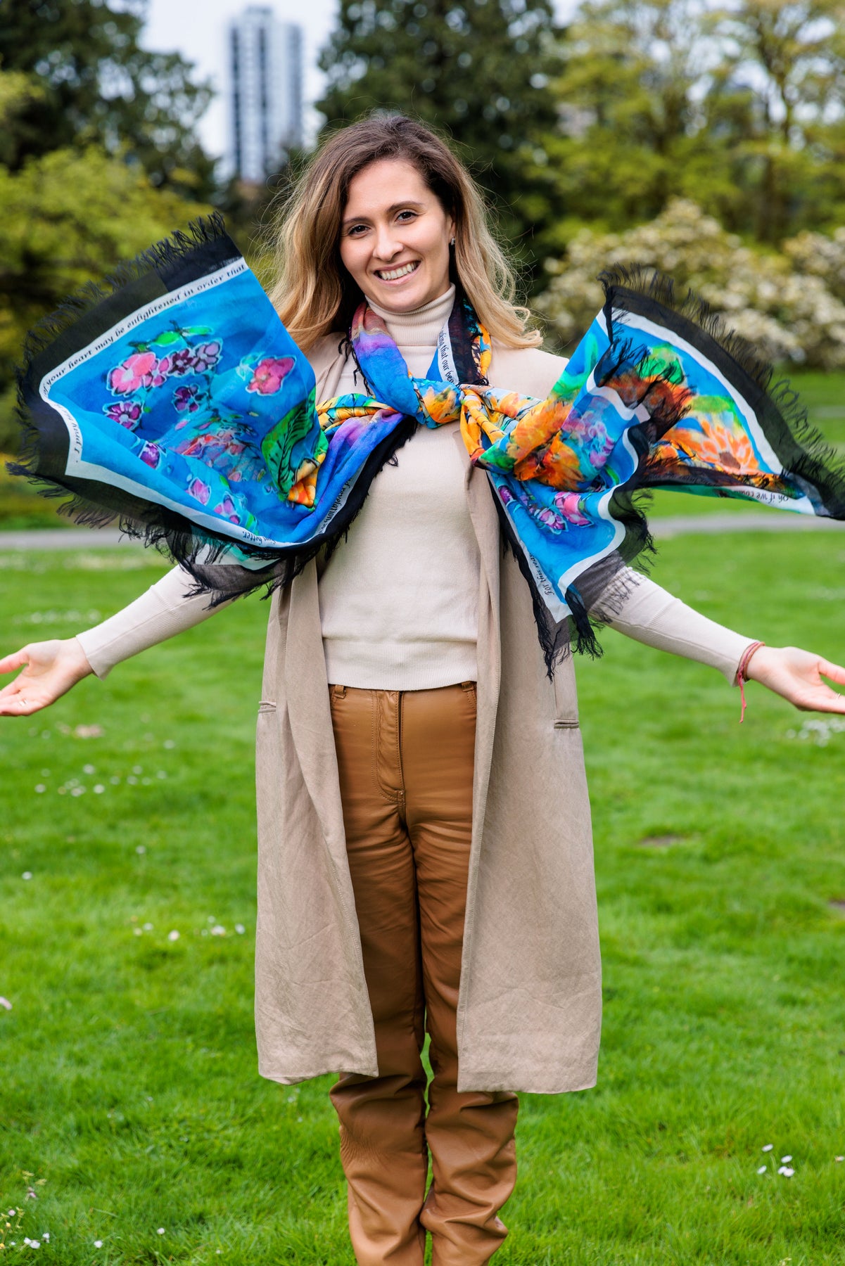 The sunflower scarf D-124A is called GLORIOUS INHERITANCE with a wonderful blessing for the world right now specifically Ukraine. It serves as a lovely prayer shawl for Ukraine and has a lovely blessing inscribed on this scarf. The proceeds will be sown back to the very people of Ukraine.