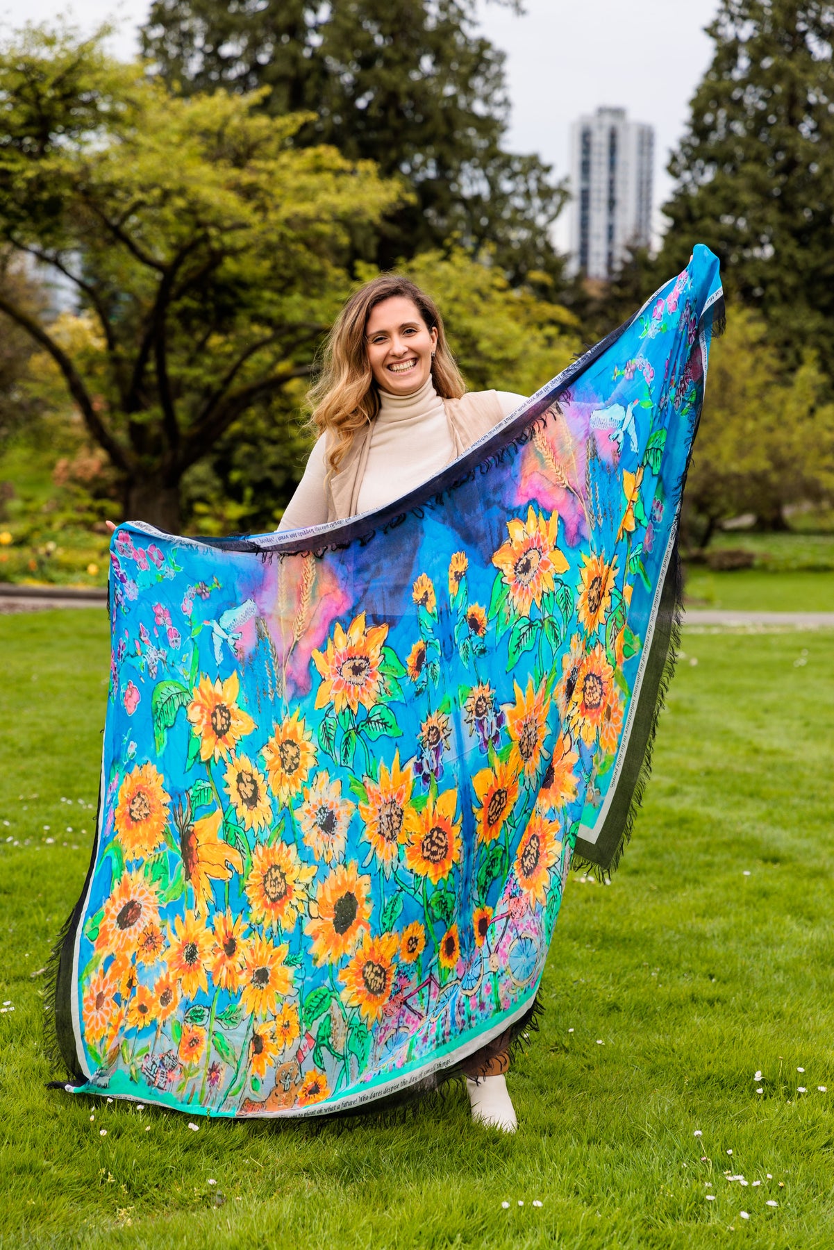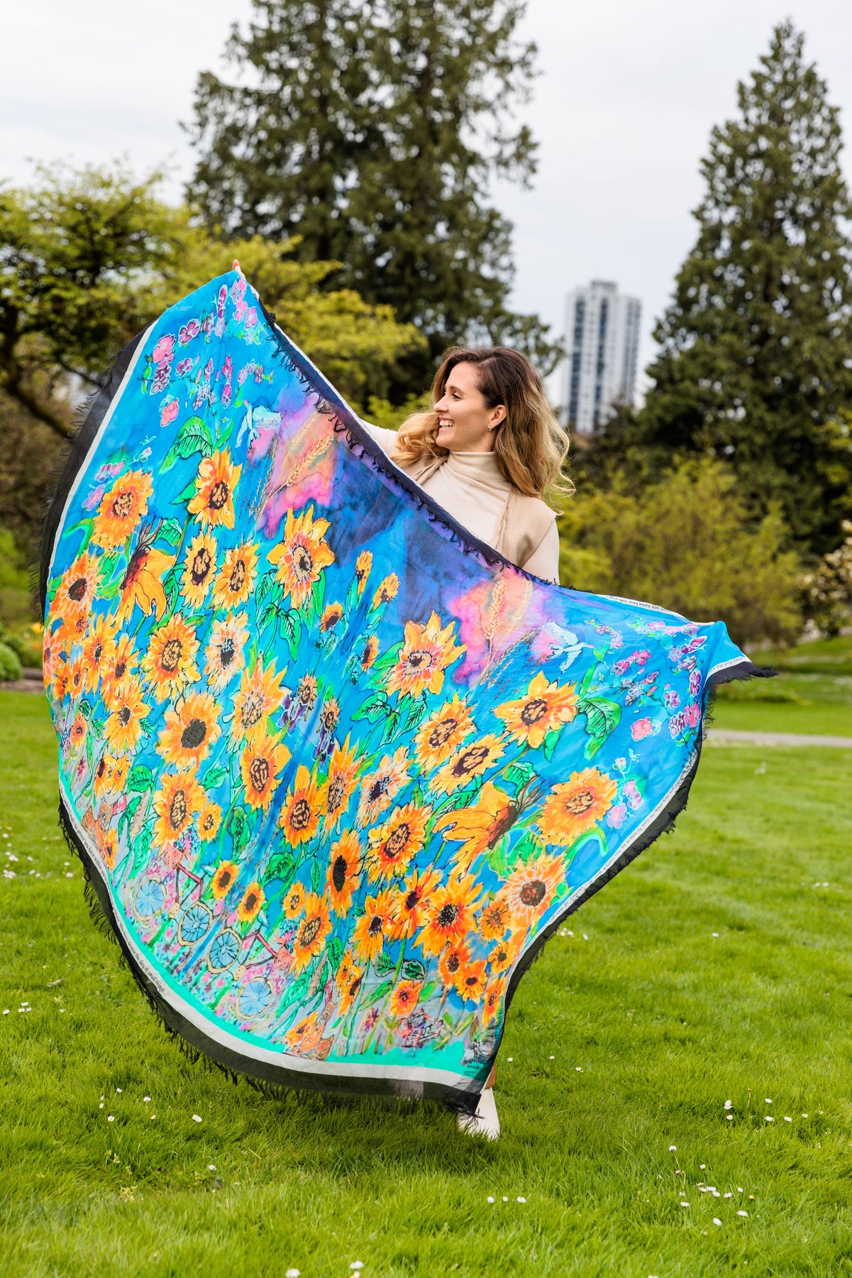 Sunflowers for Ukraine. Global prayers go out to Ukraine right now. This is a painting Canadian Ukrainian Designer Cydney hand-painted on pure silk into a luxury prayer shawl.