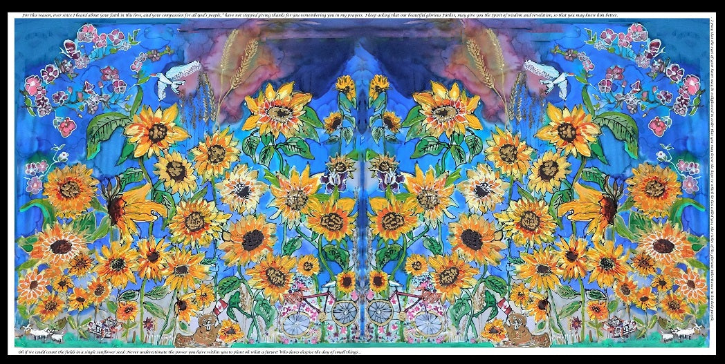 For this reason, ever since I heard about your faith in this love, and your compassion for all the people, I have not stopped giving thanks for you remembering you in my prayers. I keep asking that our beautiful glorious one may give you the Spirit of wisdom and revelation, so that you may know this love better. I pray that the eyes of your heart may be enlightened in order that you may know the hope to which love has called you, the riches of his glorious inheritance in his holy people, and this incomparably great power for us who believe… now living inside of you. Oh, if we could count the fields in a single sunflower seed. Never under estimate the power you have within you to plant and make a difference here in this world -oh what a future! Who dares despise the day of small things…?